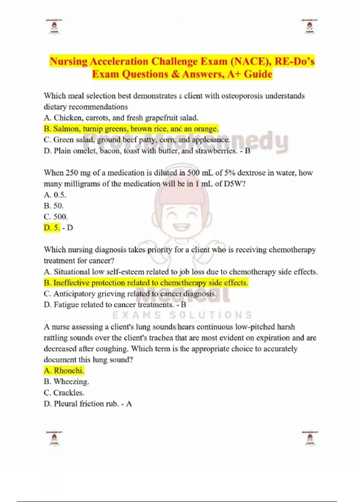 Nursing Acceleration Challenge Exam (NACE), RE-Do’s Exam Questions & Answers, A+ Guide-Which meal selection best demonstrates a client with osteoporosis understands dietary recommendations A. Chicken, carrots, and fresh grapefruit salad. B. Salmon, turnip greens, brown rice, and an orange. C. Green salad, ground beef patty, corn, and applesauce. D. Plain omelet, bacon, toast with butter, and strawberries. - B When 250 mg of a medication is diluted in 500 mL of 5% dextrose in water, how many milligrams of the medication will be in 1 mL of D5W? A. 0.5. B. 50. C. 500. D. 5. - D Which nursing diagnosis takes priority for a client who is receiving chemotherapy treatment for cancer? A. Situational low self-esteem related to job loss due to chemotherapy side effects. B. Ineffective protection related to chemotherapy side effects. C. Anticipatory grieving related to cancer diagnosis. D. Fatigue related to cancer treatments. - B A nurse assessing a client's lung sounds hears continuous low-pitched harsh rattling sounds over the client's trachea that are most evident on expiration and are decreased after coughing. Which term is the appropriate choice to accurately document this lung sound? A. Rhonchi. B. Wheezing. C. Crackles. D. Pleural friction rub. - A The nurse evaluates the client hydration status, using what assessment techniques? Select all that apply. A. Inspection of lips and mucous membranes. B. Pinches the skin on back of the hand. C. Measures pulse and blood pressure. D. Obtains client's daily weight. E. Palpates scalp and hair distribution. - A D Which client behavior is indicative of hearing loss? A. The client speaks in a low voice. B. The client refuses to answer questions. C. The client responds inappropriately to questions. D. The client looks away from persons while speaking. - C Which statement by the student nurse indicates the need for further education regarding pain management in older adults? (Select all that apply). A. "Older adults often fear becoming addicted to pain medications.". B. "Older adults often take numerous drugs which can cause interactions with pain medications.". C. "Confusion and delirium can be a more common reaction to certain pain medications in the elderly." D. "Older adults tolerate the same dosage as do younger individuals.". - D