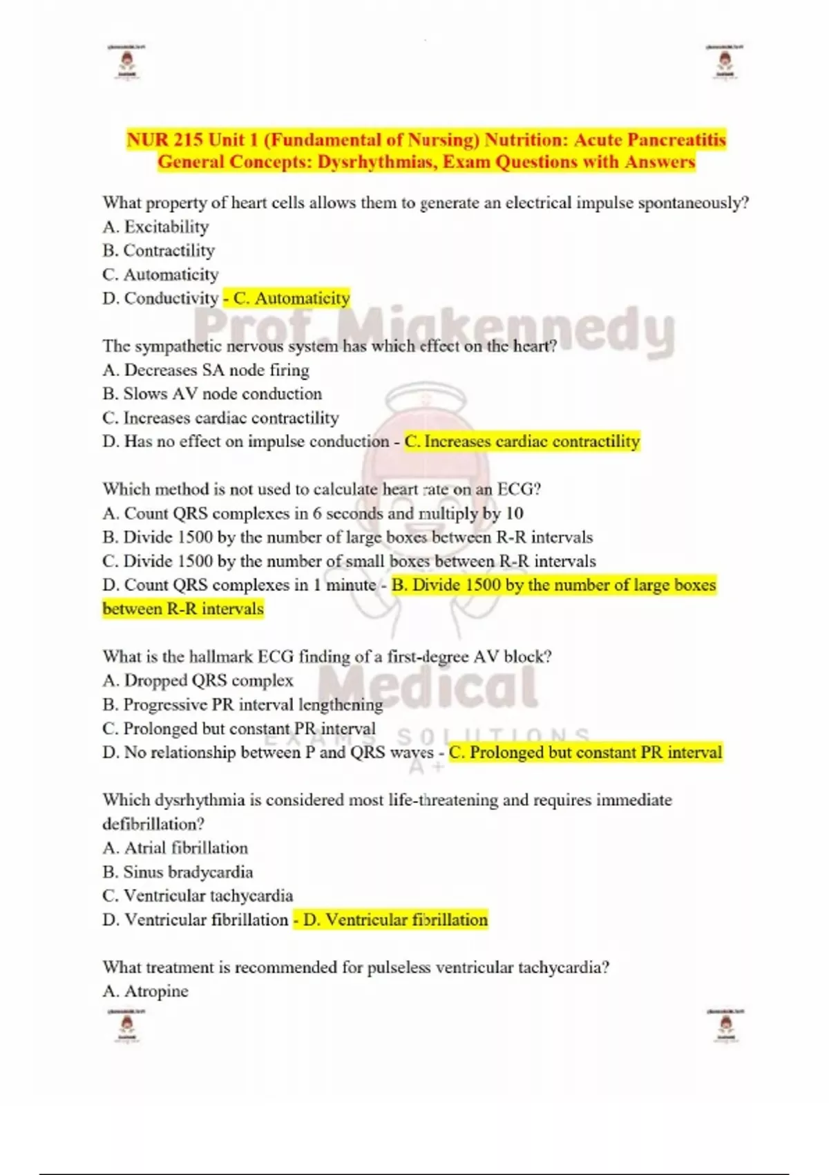 NUR 215 Unit 1 (Fundamental of Nursing) Nutrition: Acute Pancreatitis General Concepts: Dysrhythmias, Exam Questions with Answers-What property of heart cells allows them to generate an electrical impulse spontaneously? A. Excitability B. Contractility C. Automaticity D. Conductivity - C. Automaticity The sympathetic nervous system has which effect on the heart? A. Decreases SA node firing B. Slows AV node conduction C. Increases cardiac contractility D. Has no effect on impulse conduction - C. Increases cardiac contractility Which method is not used to calculate heart rate on an ECG? A. Count QRS complexes in 6 seconds and multiply by 10 B. Divide 1500 by the number of large boxes between R-R intervals C. Divide 1500 by the number of small boxes between R-R intervals D. Count QRS complexes in 1 minute - B. Divide 1500 by the number of large boxes between R-R intervals What is the hallmark ECG finding of a first-degree AV block? A. Dropped QRS complex B. Progressive PR interval lengthening C. Prolonged but constant PR interval D. No relationship between P and QRS waves - C. Prolonged but constant PR interval Which dysrhythmia is considered most life-threatening and requires immediate defibrillation? A. Atrial fibrillation B. Sinus bradycardia C. Ventricular tachycardia D. Ventricular fibrillation - D. Ventricular fibrillation What treatment is recommended for pulseless ventricular tachycardia? A. Atropine B. CPR and rapid defibrillation C. Adenosine D. Synchronized cardioversion - B. CPR and rapid defibrillation Which device delivers a shock synchronized with the R wave? A. Pacemaker B. ICD C. Defibrillator D. Synchronized cardioversion - D. Synchronized cardioversion Torsades de Pointes is best treated with: A. Atropine B. Lidocaine C. IV Magnesium D. Beta blockers - C. IV Magnesium The SA node normally fires at a rate of 60-100 bpm. True False - True Ventricular fibrillation may be pulseless or have a weak pulse. True False - False Atropine is a treatment for symptomatic bradycardia. True False - True Defibrillation is used for asystole. True False - False Patients with an ICD should avoid MRI unless device-approved. True False - True What does a prolonged PR interval on an ECG suggest? A. Atrial fibrillation B. First-degree AV block C. Ventricular fibrillation D. Third-degree AV block - B. First-degree AV block Which condition is characterized by a progressively lengthening PR interval until a QRS complex is dropped? A. First-degree AV block B. Second-degree AV block Type 1 (Mobitz I) C. Second-degree AV block Type 2 (Mobitz II) D. Third-degree AV block - B. Second-degree AV block Type 1 (Mobitz I) Which pacemaker complication involves the pacemaker failing to recognize intrinsic cardiac activity? A. Failure to capture B. Failure to pace C. Failure to sense D. Oversensing - C. Failure to sense Which electrolyte imbalance is commonly associated with Torsades de Pointes? A. Hyperkalemia B. Hypernatremia C. Hypomagnesemia D. Hypoglycemia - C. Hypomagnesemia What is the treatment of choice for ventricular fibrillation? A. Synchronized cardioversion B. Atropine C. Defibrillation D. IV magnesium - C. Defibrillation The SA node normally fires at a rate of ________________ beats per minute. - 60-100 ________________ pacing is used when both ventricles are paced to resynchronize the heart cycle, often in heart failure patients. - CRT A ________________ is a temporary measure that uses external pads to deliver pacing impulses through the chest wall. - Transcutaneous Pacemaker