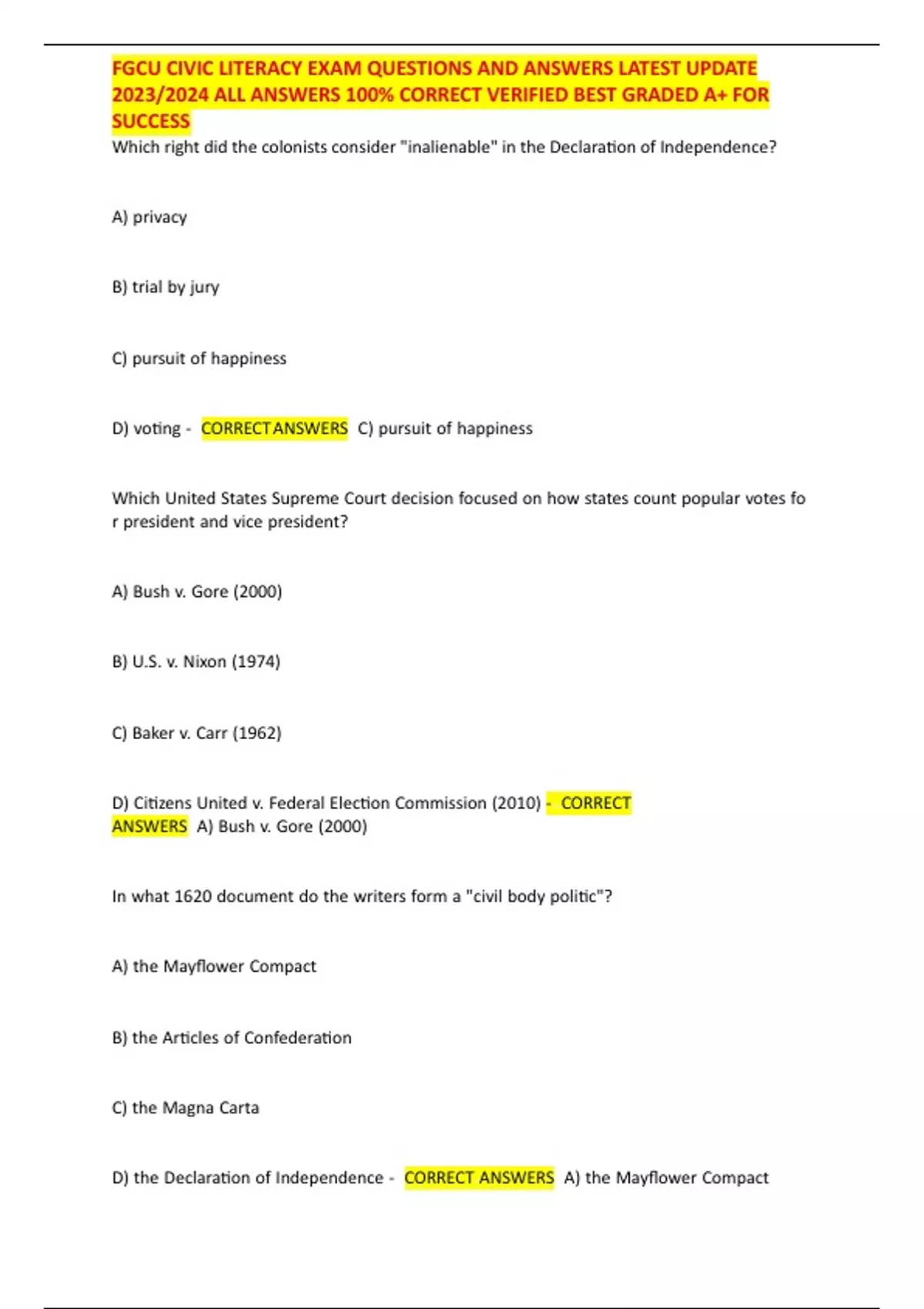, FGCU CIVIC LITERACY EXAM QUESTIONS AND ANSWERS LATEST UPDATE