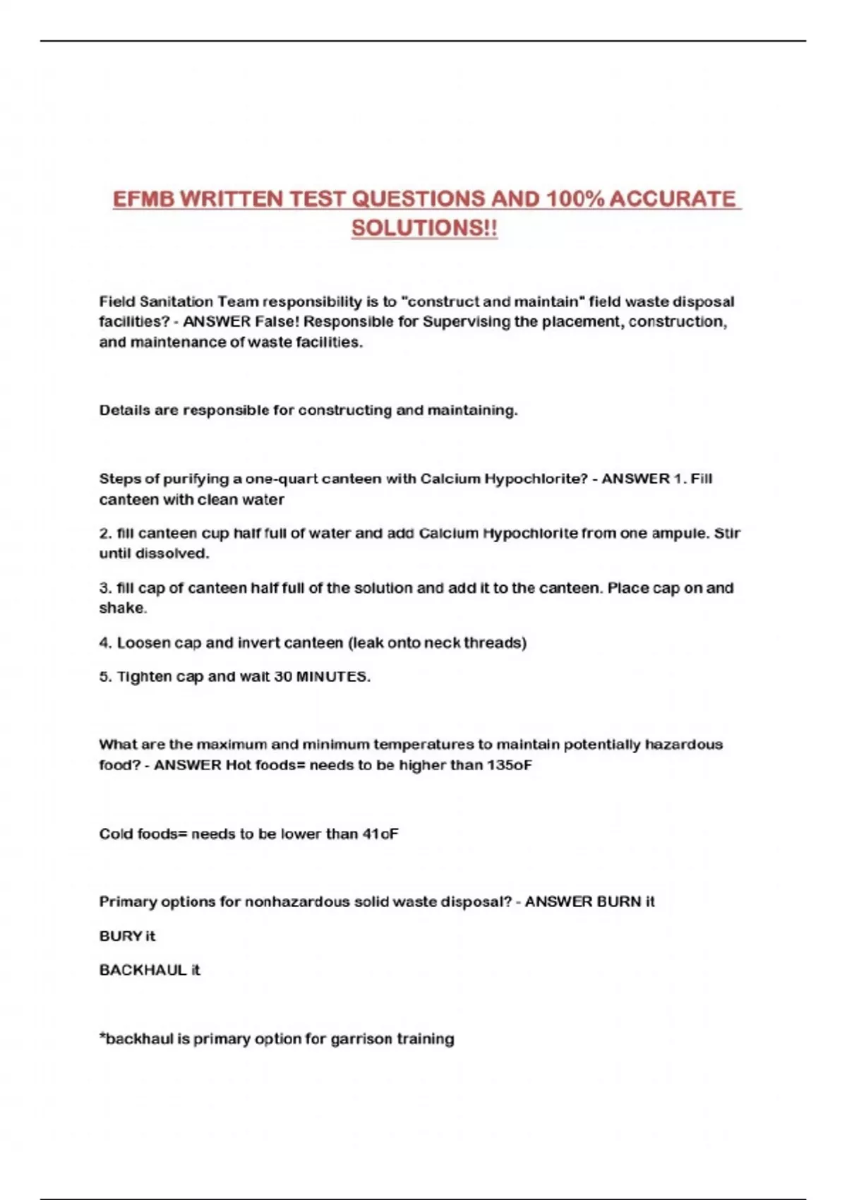 EFMB WRITTEN TEST QUESTIONS AND 100% ACCURATE SOLUTIONS!!...