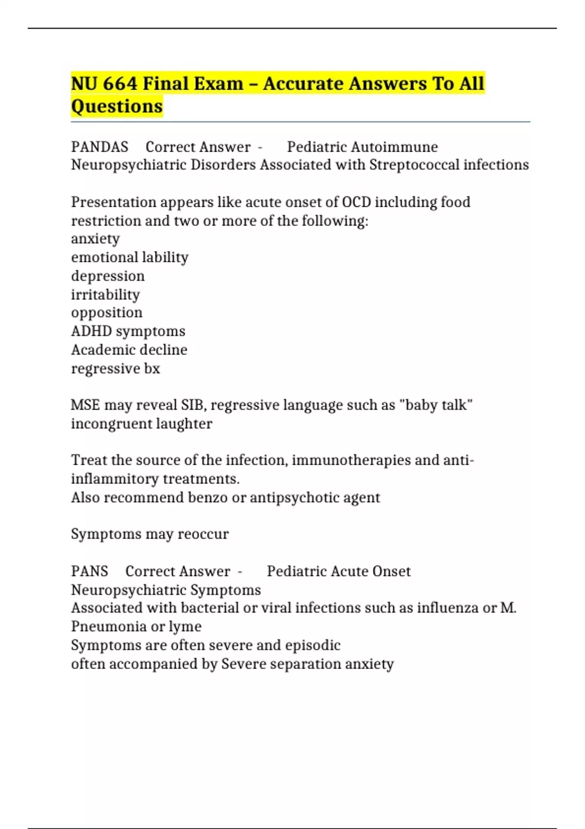 PANS Correct Answer - Pediatric Acute Onset
