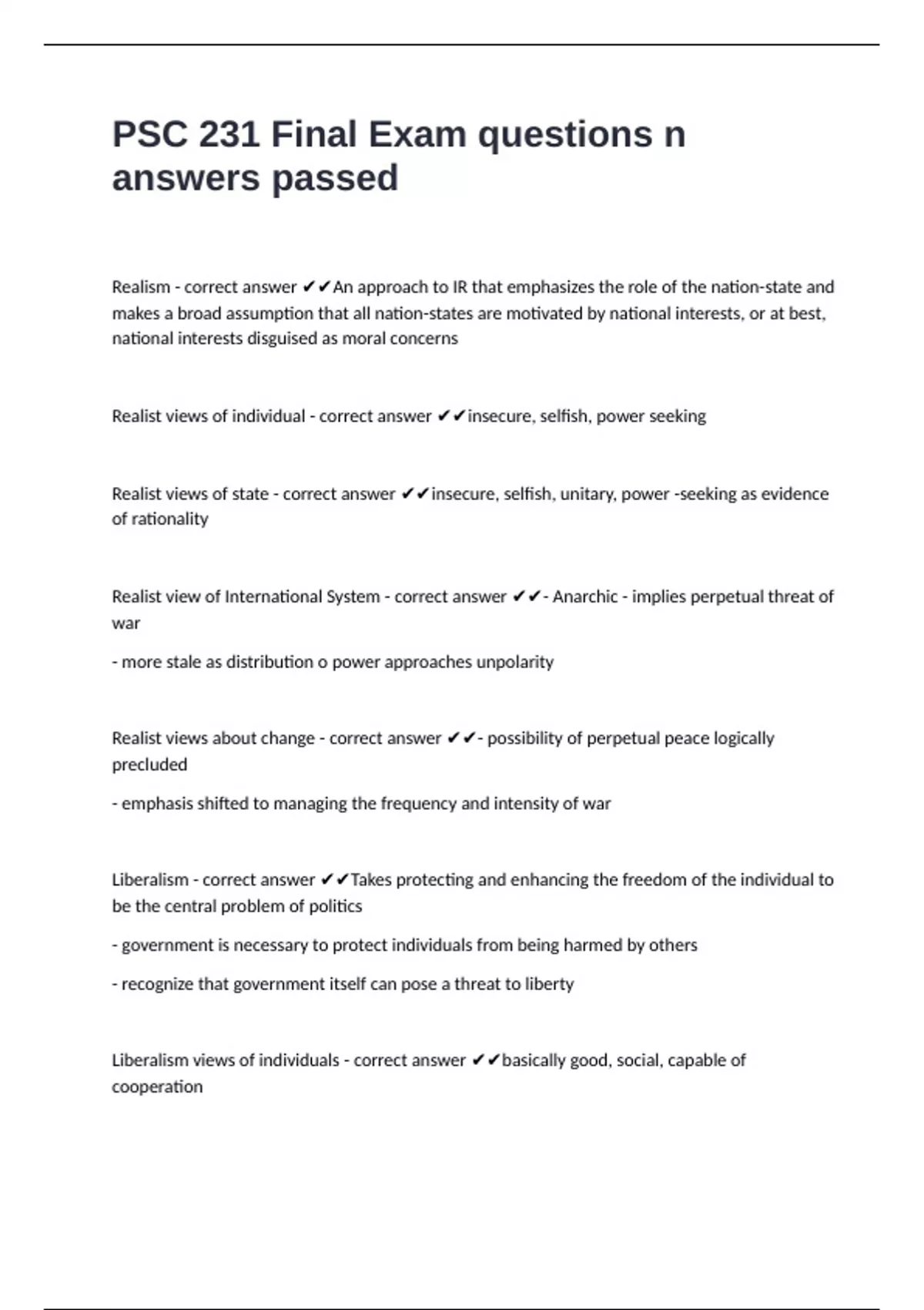 Realist view of International System - correct answer ✔✔- Anarchic - implies perpetual threat of