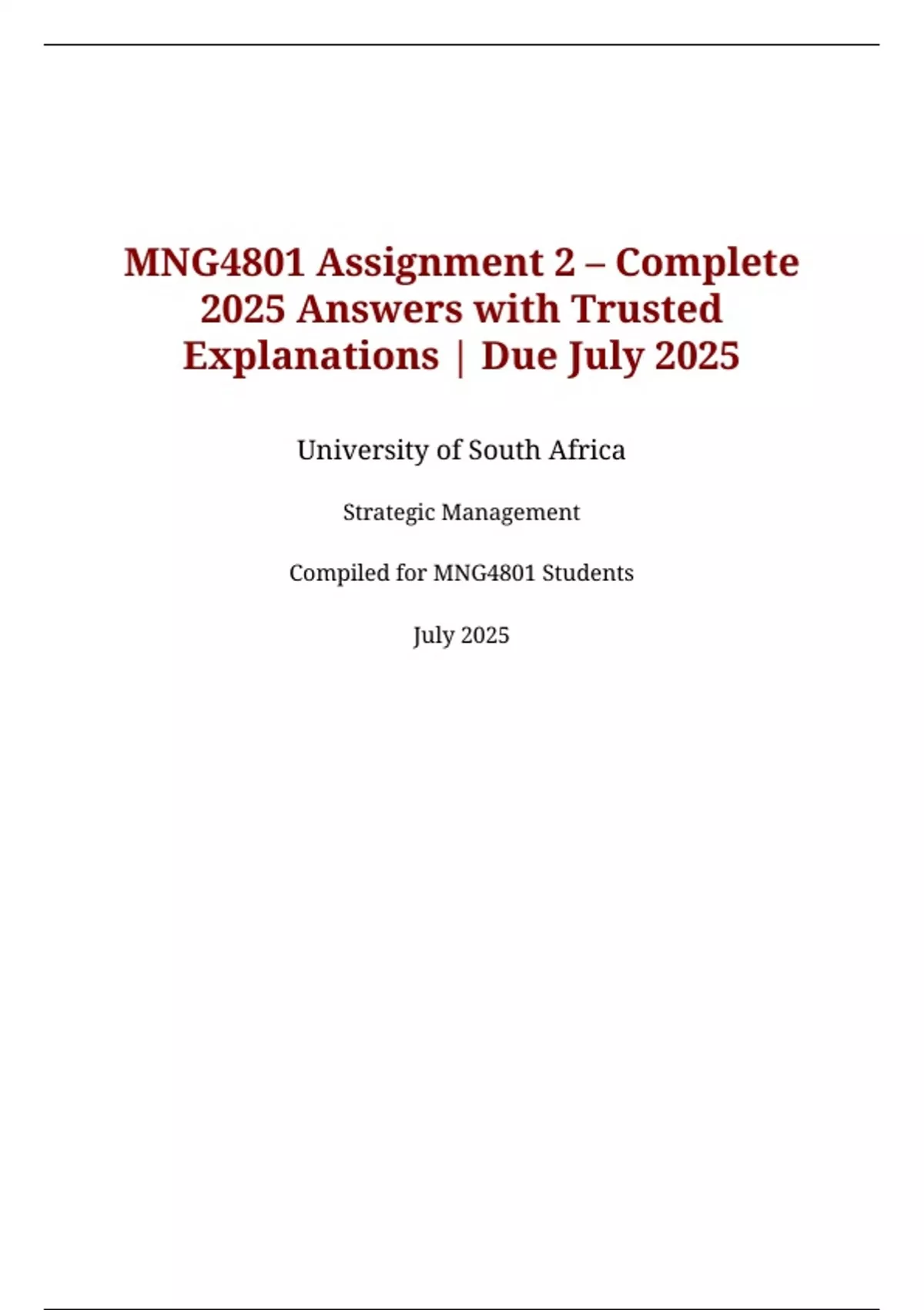 MNG4801 Assignment 2 – Complete 2025 Answers with Trusted Explanations | Due July 2025 University of South Africa Strategic Management Compiled for MNG4801 Students July 2025 Introduction This document provides detailed answers to 100 carefully curated questions for MNG4801 Assignment 2, due July 2025, for the Strategic Management course at the University of South Africa. The questions focus on key concepts such as strategic analysis, formulation, implementation, and evaluation, with practical applications to a case study on Shoprite’s strategies. Each question is highlighted in a very dark red color for clarity, and answers are concise yet comprehensive, ensuring students can grasp and apply strategic management principles effectively.