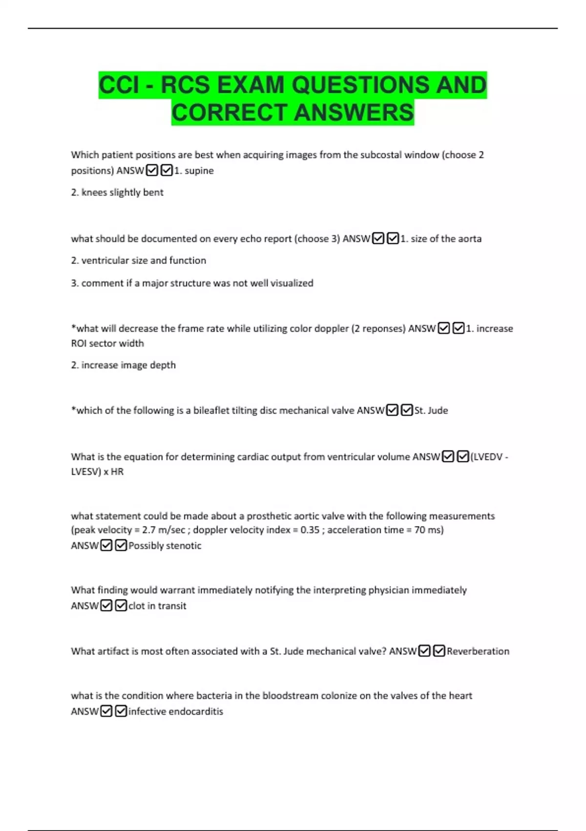 CCI - RCS EXAM QUESTIONS AND CORRECT ANSWERS Which patient positions are best when acquiring images from the subcostal window (choose 2 positions) ANSW1. supine 2. knees slightly bent what should be documented on every echo report (choose 3) ANSW1. size of the aorta 2. ventricular size and function 3. comment if a major structure was not well visualized