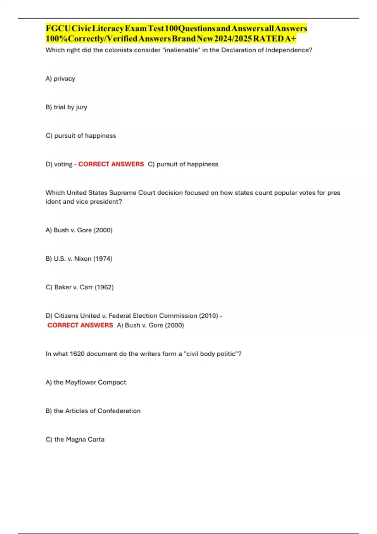 ,FGCU Civic Literacy Exam Test 100Questions and Answers all Answers