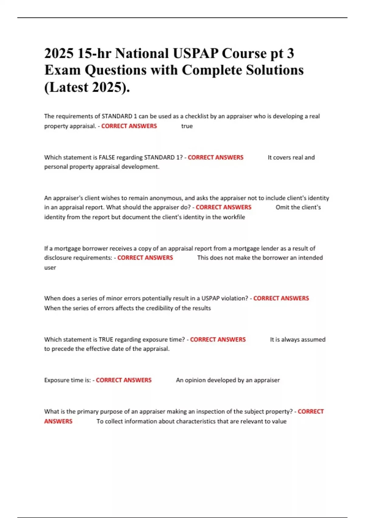 Exposure time is: - CORRECT ANSWERS An opinion developed by an appraiser