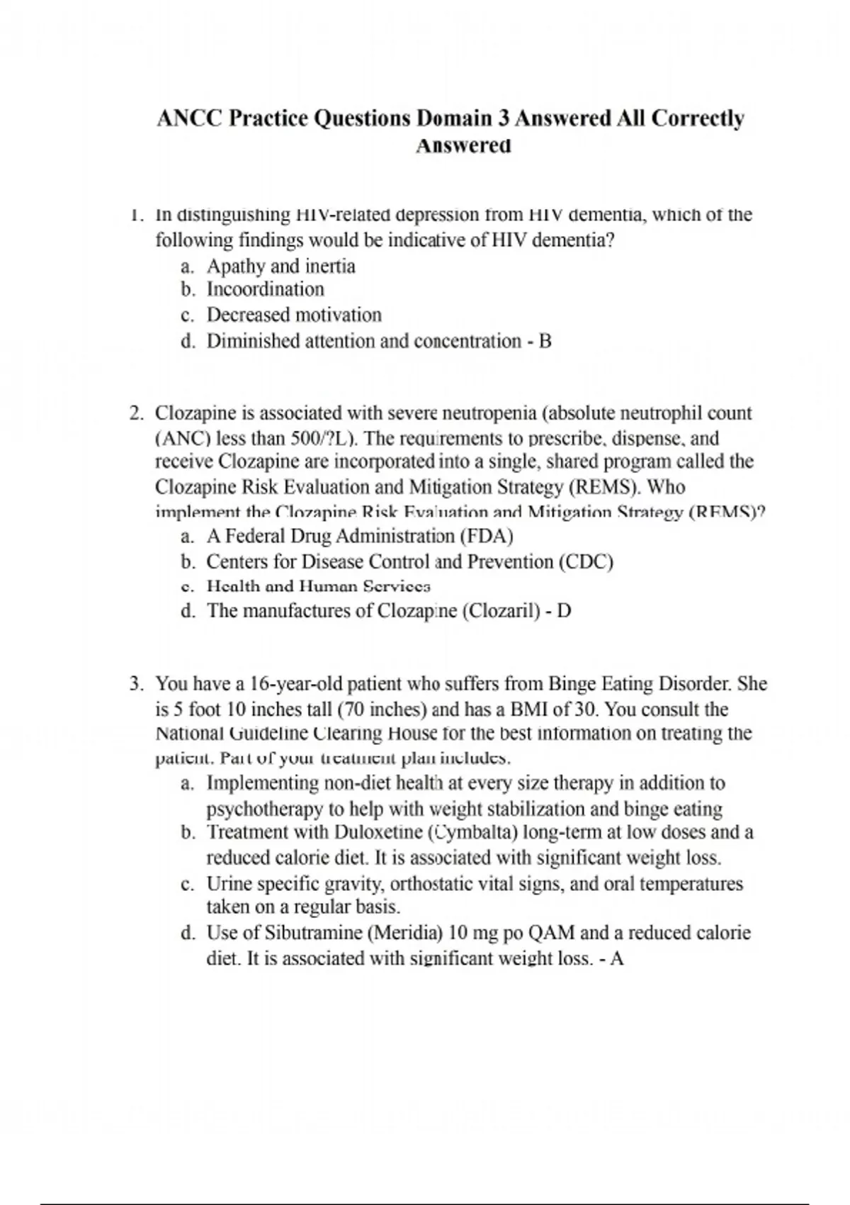 1. In distinguishing HIV-related depression from HIV dementia, which of the following findings would be indicative of HIV dementia? a. Apathy and inertia b. Incoordination c. Decreased motivation d. Diminished attention and concentration - B 2. Clozapine is associated with severe neutropenia (absolute neutrophil count (ANC) less than 500/?L). The requirements to prescribe, dispense, and receive Clozapine are incorporated into a single, shared program called the Clozapine Risk Evaluation and Mitigation Strategy (REMS). Who implement the Clozapine Risk Evaluation and Mitigation Strategy (REMS)? a. A Federal Drug Administration (FDA) b. Centers for Disease Control and Prevention (CDC) c. Health and Human Services d. The manufactures of Clozapine (Clozaril) - D 3. You have a 16-year-old patient who suffers from Binge Eating Disorder. She is 5 foot 10 inches tall (70 inches) and has a BMI of 30. You consult the National Guideline Clearing House for the best information on treating the patient. Part of your treatment plan includes: a. Implementing non-diet health at every size therapy in addition to psychotherapy to help with weight stabilization and binge eating b. Treatment with Duloxetine (Cymbalta) long-term at low doses and a reduced calorie diet. It is associated with significant weight loss. c. Urine specific gravity, orthostatic vital signs, and oral temperatures taken on a regular basis. d. Use of Sibutramine (Meridia) 10 mg po QAM and a reduced