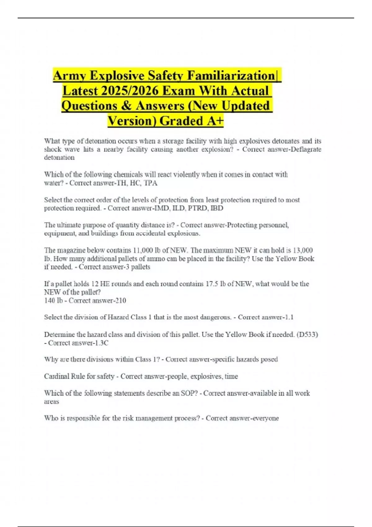 Army Explosive Safety Familiarization| Latest 2025/2026 Exam With Actual Questions & Answers (New Updated Version) Graded A+ What type of detonation occurs when a storage facility with high explosives detonates and its shock wave hits a nearby facility causing another explosion? - Correct answer-Deflagrate detonation Which of the following chemicals will react violently when it comes in contact with water? - Correct answer-TH, HC, TPA Select the correct order of the levels of protection from least protection required to most protection required. - Correct answer-IMD, ILD, PTRD, IBD The ultimate purpose of quantity distance is? - Correct answer-Protecting personnel, equipment, and buildings from accidental explosions. The magazine below contains 11,000 lb of NEW. The maximum NEW it can hold is 13,000 lb. How many additional pallets of ammo can be placed in the facility? Use the Yellow Book if needed. - Correct answer-3 pallets If a pallet holds 12 HE rounds and each round contains 17.5 lb of NEW, what would be the NEW of the pallet? 140 lb - Correct answer-210
