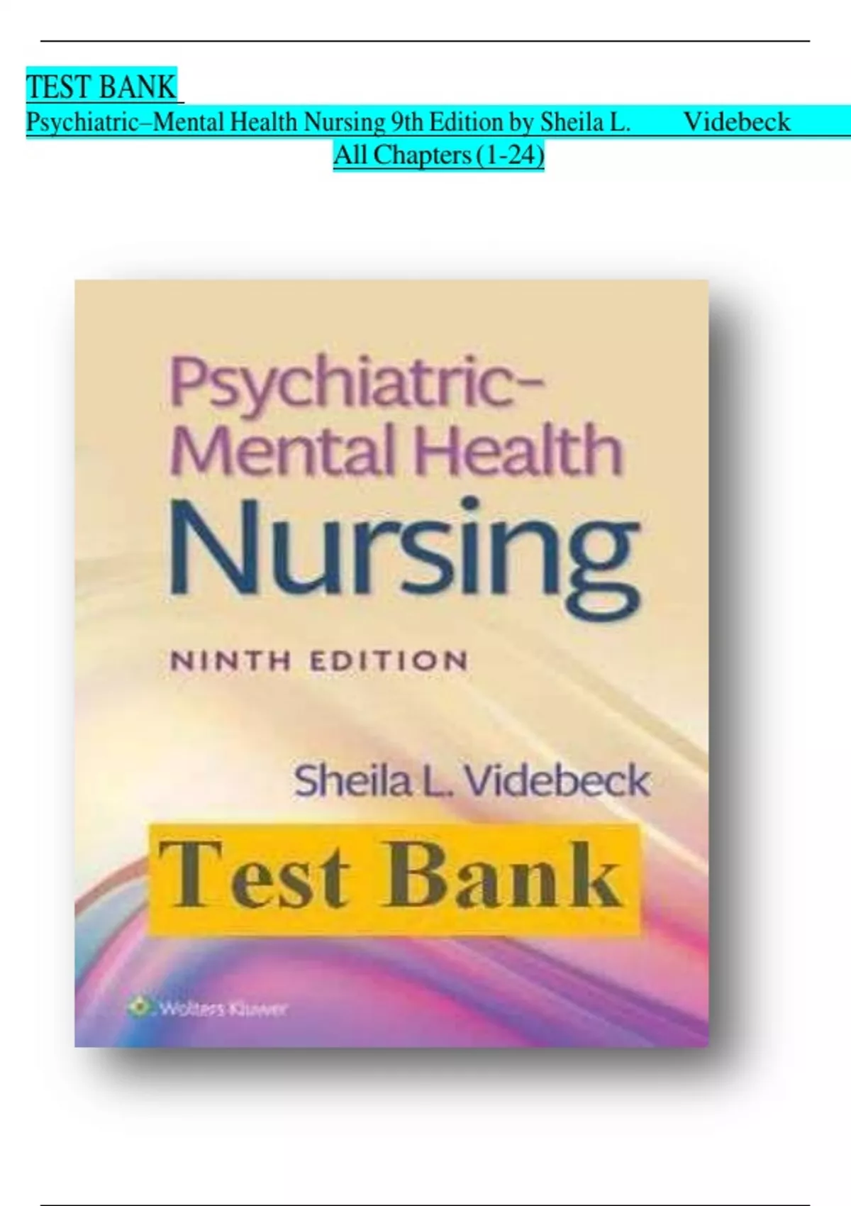 Psychiatric-Mental Health Nursing – 9th Edition by Sheila L. Videbeck – Complete Test Bank (Chapters 1–24) with Exam Questions and Answers