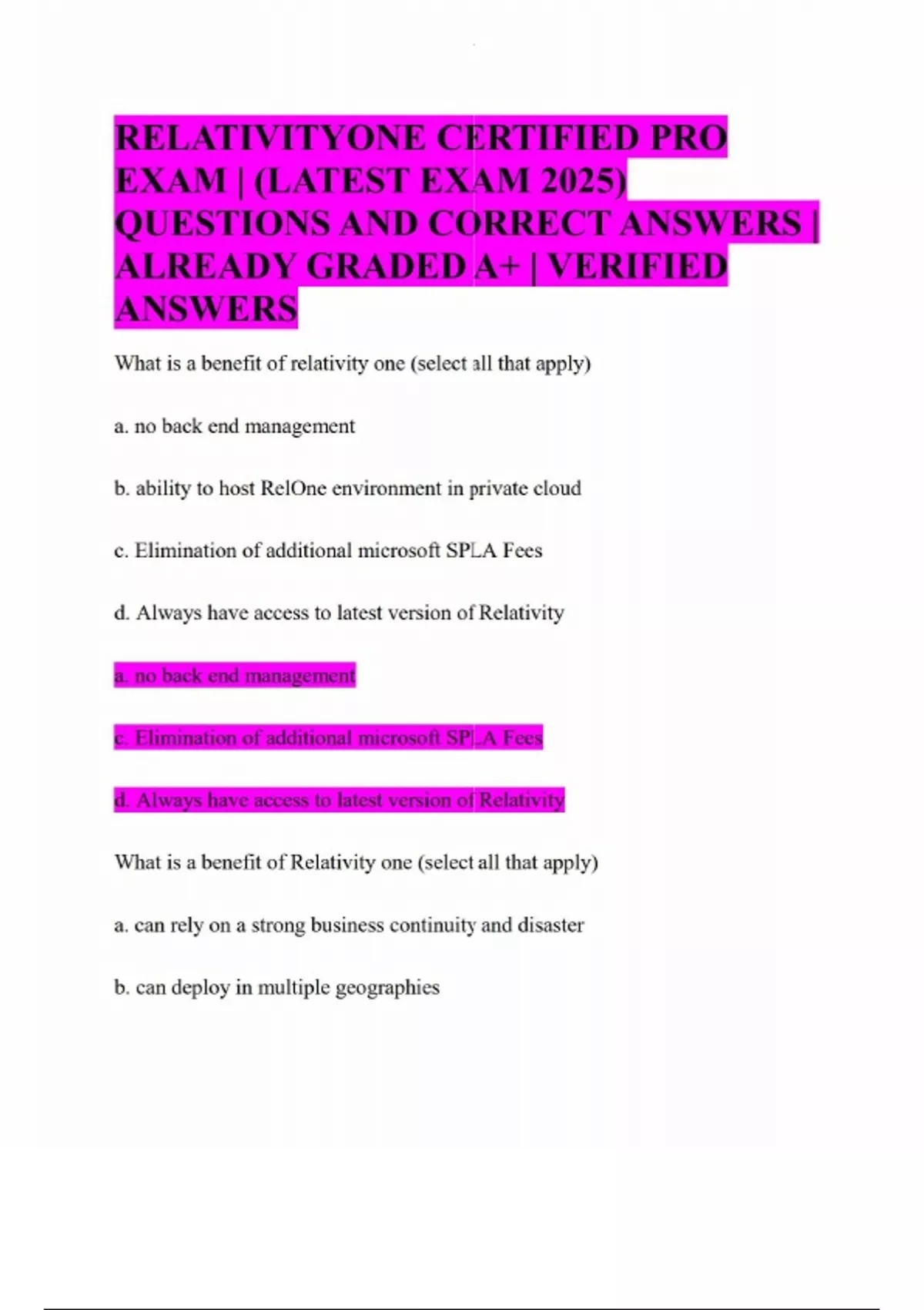 RELATIVITYONE CERTIFIED PRO EXAM | (LATEST EXAM 2025) QUESTIONS AND CORRECT ANSWERS |ALREADY GRADED A+ | VERIFIEDANSWERS What is a benefit of relativity one (select all that apply) a. no back end management b. ability to host RelOne environment in private cloud c. Elimination of additional microsoft SPLA Fees d. Always have access to latest version of Relativity a. no back end management c. Elimination of additional microsoft SPLA Fees d. Always have access to latest version of Relativity What is a benefit of Relativity one (select all that apply) a. can rely on a strong business continuity and disaster b. can deploy in multiple geographiesc. Can preview new features before general availability date d. Can run previous versions of relativity a. can rely on a strong business continuity and disaster b. can deploy in multiple geographies c. Can preview new features before general availability date When is relativity one encrypted? a. before loading into RelOne b. in transit c. only with customer managed key option d. at rest a. in Transit d. At rest What counts towards billable data in RelativityOne workspaces? (Select all that apply.) a. SQL database b. Nativesc. Productions d. Index size b. Natives c. Productions What can you do in RelativityOne mobile app? (Select all that apply) a. code documents b. run an already created saved search c. create a workspace d. share documents with other Relativity users a. code documents b. run an already created saved search c. create a workspace d. share documents with other Relativity users When do changes made in the RelativityOne mobile app appear in RelativityOne?