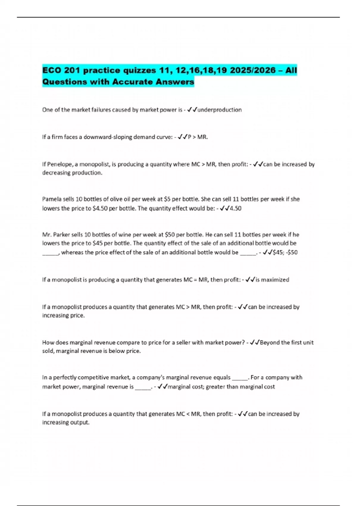 PACKAGE DEAL FOR ECO 201 Exams 2025/2026 – Verified Questions and Correct Answers