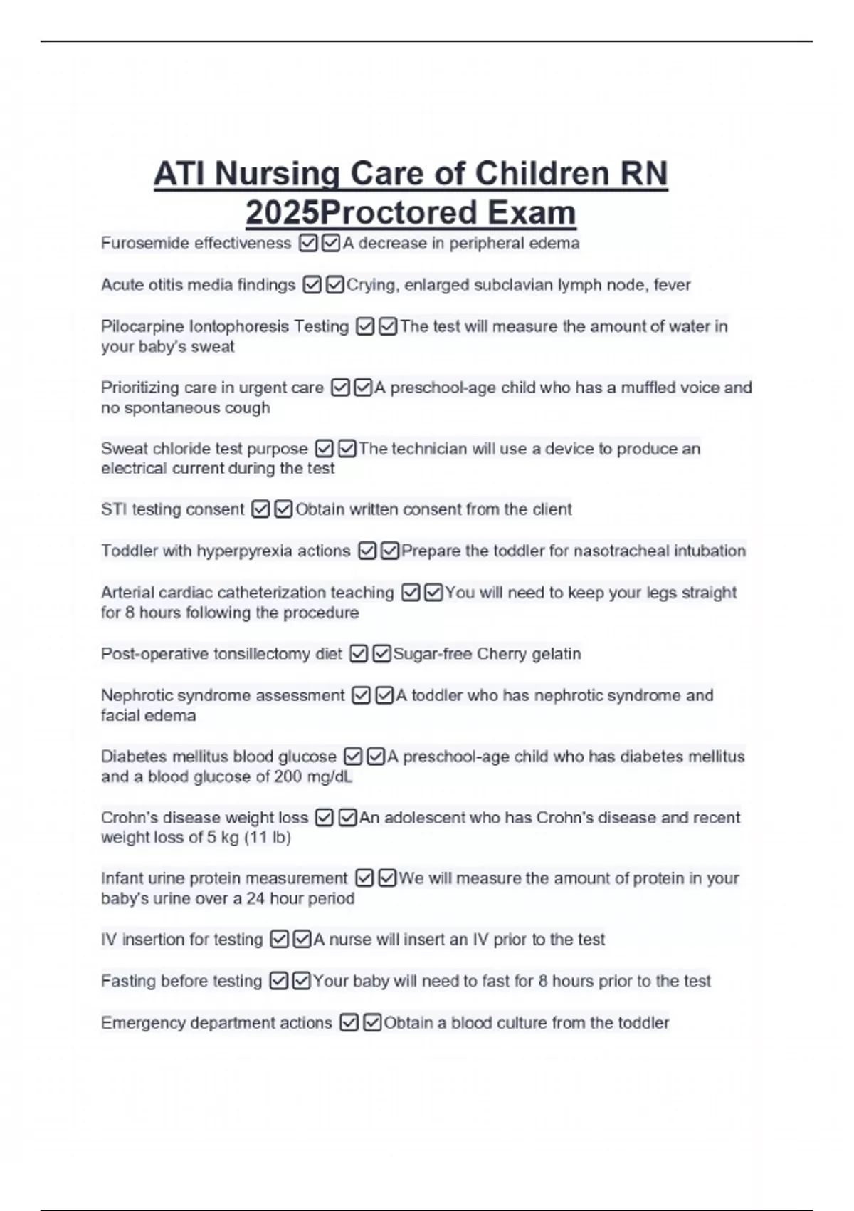 ATI Nursing Care of Children RN 2025Proctored Exam Furosemide effectiveness A decrease in peripheral edema Acute otitis media findings Crying, enlarged subclavian lymph node, fever Pilocarpine Iontophoresis Testing The test will measure the amount of water in your baby's sweat Prioritizing care in urgent care A preschool-age child who has a muffled voice and no spontaneous cough Sweat chloride test purpose The technician will use a device to produce an electrical current during the test STI testing consent Obtain written consent from the client Toddler with hyperpyrexia actions Prepare the toddler for nasotracheal intubation Arterial cardiac catheterization teaching You will need to keep your legs straight for 8 hours following the procedure Post-operative tonsillectomy diet Sugar-free Cherry gelatin