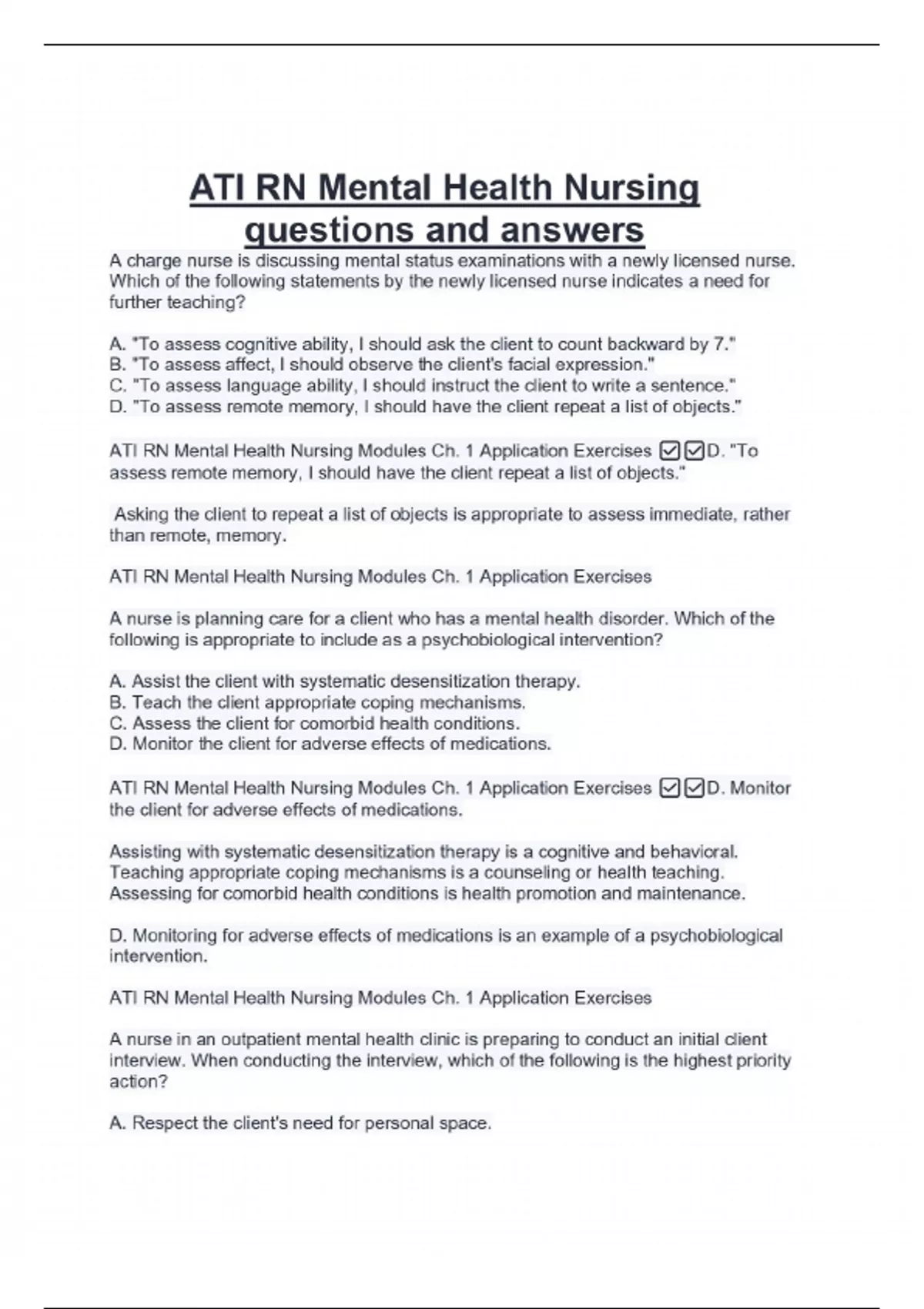 ATI RN Mental Health Nursing questions and answers A charge nurse is discussing mental status examinations with a newly licensed nurse. Which of the following statements by the newly licensed nurse indicates a need for further teaching? A. "To assess cognitive ability, I should ask the client to count backward by 7." B. "To assess affect, I should observe the client's facial expression." C. "To assess language ability, I should instruct the client to write a sentence." D. "To assess remote memory, I should have the client repeat a list of objects." ATI RN Mental Health Nursing Modules Ch. 1 Application Exercises D. "To assess remote memory, I should have the client repeat a list of objects." Asking the client to repeat a list of objects is appropriate to assess immediate, rather
