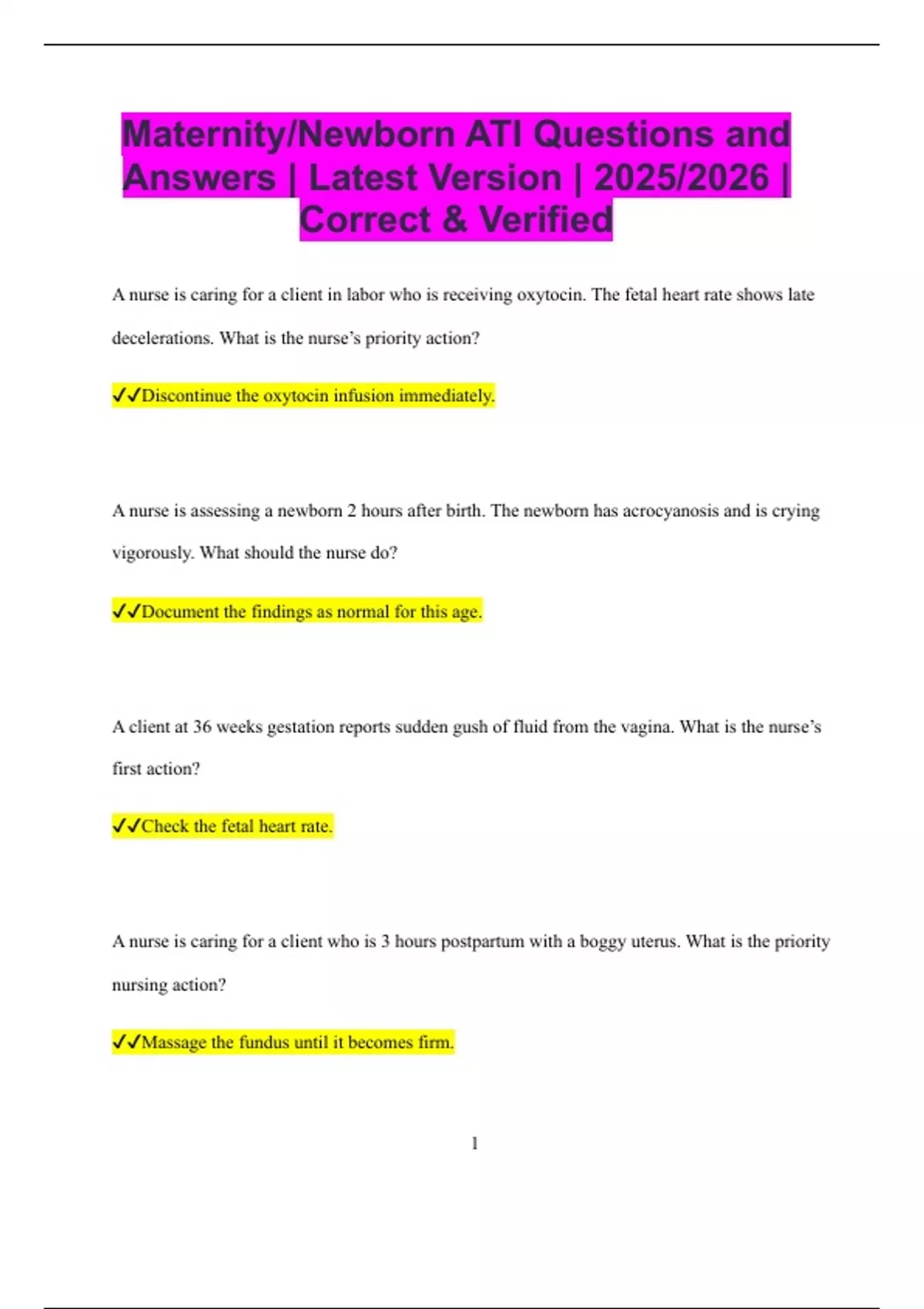 Maternity/Newborn ATI Questions and Answers | Latest Version | 2025/2026 | Correct & Verified A nurse is caring for a client in labor who is receiving oxytocin. The fetal heart rate shows late decelerations. What is the nurse’s priority action? Discontinue the oxytocin infusion immediately. A nurse is assessing a newborn 2 hours after birth. The newborn has acrocyanosis and is crying vigorously. What should the nurse do? Document the findings as normal for this age. A client at 36 weeks gestation reports sudden gush of fluid from the vagina. What is the nurse’s first action? Check the fetal heart rate. A nurse is caring for a client who is 3 hours postpartum with a boggy uterus. What is the priority nursing action? Massage the fundus until it becomes firm. 2 A newborn has a respiratory rate of 68 breaths per minute and nasal flaring. What should the nurse do? Notify the provider of signs of respiratory distress. A nurse is caring for a client who is breastfeeding and reports cracked nipples. What is the best nursing intervention? Ensure the infant is latching deeply onto the areola. A client in labor is having contractions every 2 minutes lasting 90 seconds with minimal rest between. What is the priority action? Stop oxytocin and notify the provider due to uterine tachysystole. A nurse is teaching a client about signs of true labor. What should the nurse include? Contractions become stronger, more regular, and increase with activity. A nurse is assessing a newborn and notes a positive Babinski reflex. What should the nurse do? Document the finding as normal in a newborn. 3 A client at 38 weeks reports decreased fetal movement. What is the priority nursing action? Instruct the client to come to the facility for further evaluation. A nurse is caring for a postpartum client with a saturated perineal pad within 15 minutes. What is the priority nursing intervention? Assess the fundus for firmness and location. A newborn is placed under a radiant warmer after delivery. What is the primary reason for this intervention? To prevent cold stress and hypoglycemia.