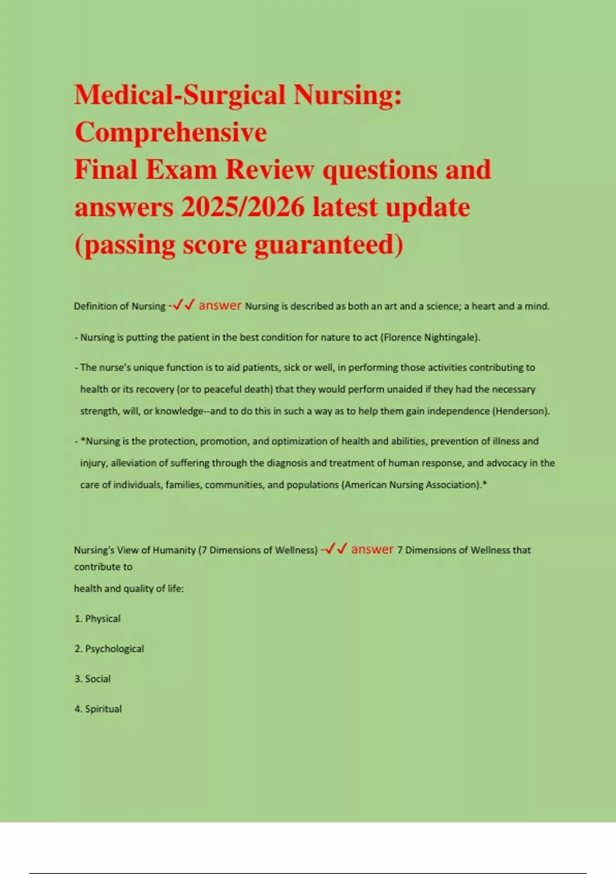 Unlock your success with this Medical-Surgical Nursing Comprehensive Final Exam Review 2025/2026 — the latest update to help you pass your Med-Surg exams and NCLEX RN/PN with confidence. This PDF includes hundreds of up-to-date multiple-choice questions and answers, clear explanations, definitions, rationales, core concepts, nursing processes, and patient care scenarios exactly like you’ll see on your nursing school exams. Covers Florence Nightingale principles, QSEN competencies, ANA standards, clinical judgment, nursing process (ADPIE), evidence-based practice, cultural competency, preoperative, intraoperative, and postoperative care, musculoskeletal assessment, and much more. Perfect for: Medical-Surgical Nursing students NCLEX RN/PN test-takers Nursing fundamentals reviews Last-minute nursing exam prep Linked with Lewis’s Medical-Surgical Nursing textbook for easy reference and study alignment. Save hours of study time — pass with confidence and get your dream nursing license!