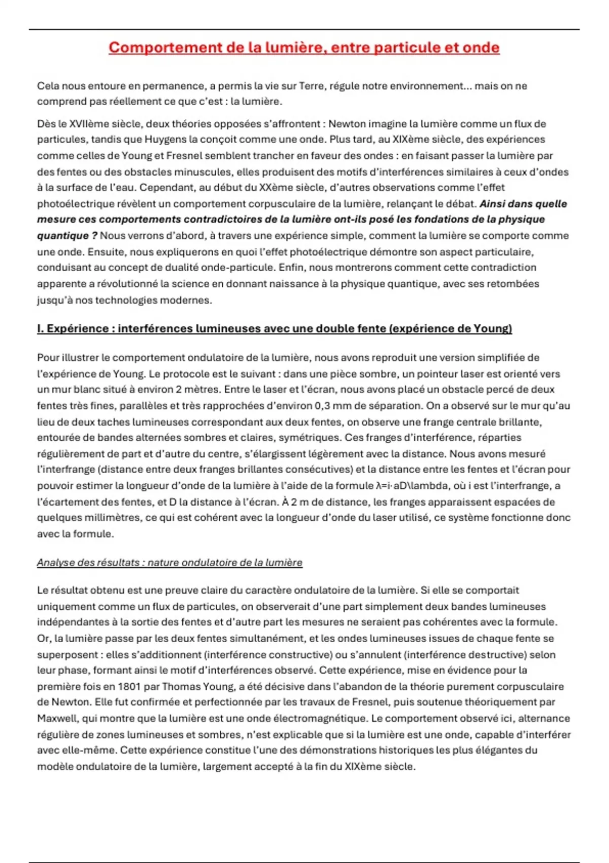 particules, tandis que Huygens la conçoit comme une onde. Plus tard, au XIXème siècle, des expériences