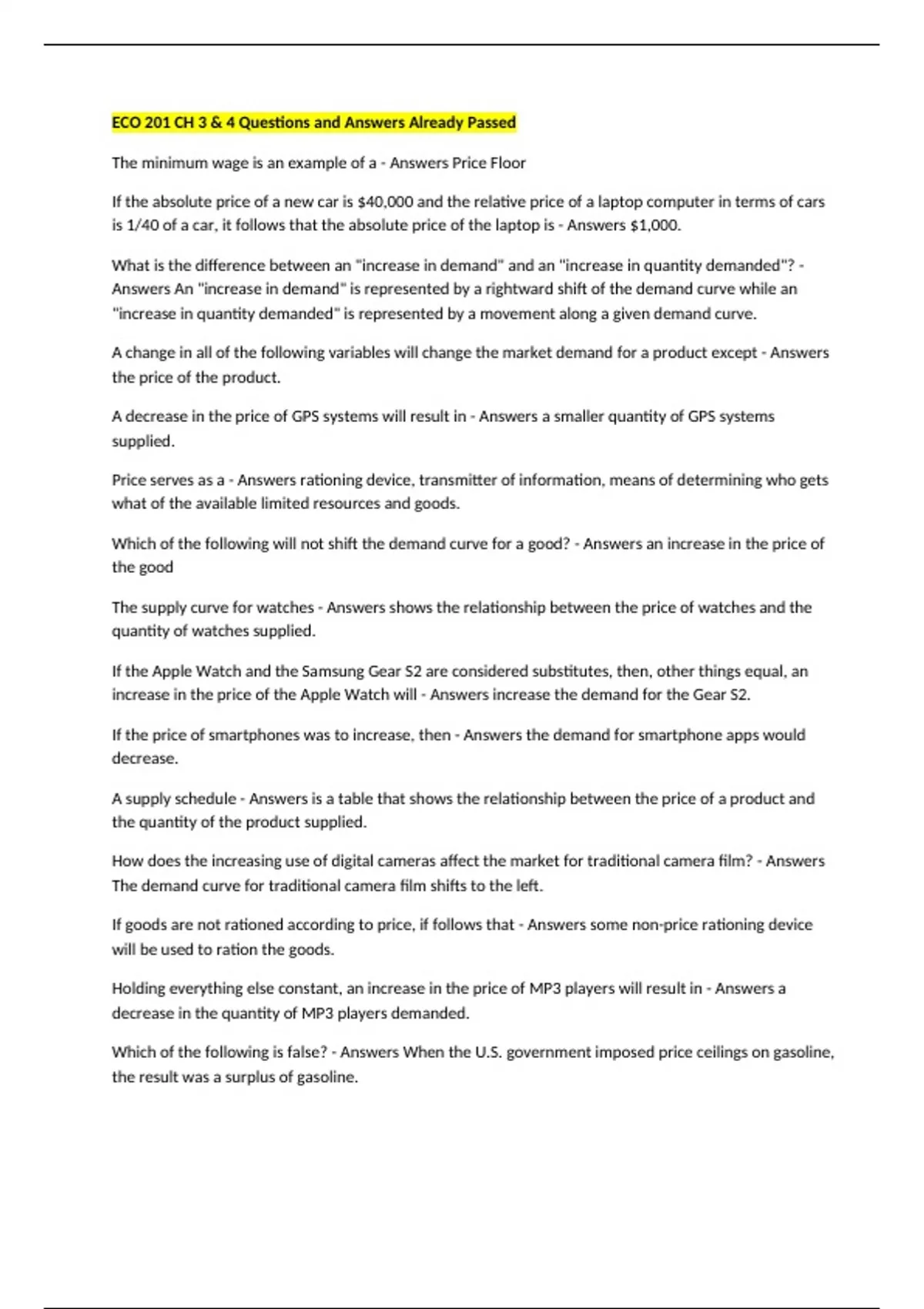 ECO 201 CH 3 & 4 Questions and Answers Already Passed The minimum wage is an example of a - Answers Price Floor If the absolute price of a new car is $40,000 and the relative price of a laptop computer in terms of cars is 1/40 of a car, it follows that the absolute price of the laptop is - Answers $1,000. What is the difference between an "increase in demand" and an "increase in quantity demanded"? - Answers An "increase in demand" is represented by a rightward shift of the demand curve while an "increase in quantity demanded" is represented by a movement along a given demand curve. A change in all of the following variables will change the market demand for a product except - Answers the price of the product. A decrease in the price of GPS systems will result in - Answers a smaller quantity of GPS systems supplied. Price serves as a - Answers rationing device, transmitter of information, means of determining who gets what of the available limited resources and goods. Which of the following will not shift the demand curve for a good? - Answers an increase in the price of the good The supply curve for watches - Answers shows the relationship between the price of watches and the quantity of watches supplied. If the Apple Watch and the Samsung Gear S2 are considered substitutes, then, other things equal, an increase in the price of the Apple Watch will - Answers increase the demand for the Gear S2. If the price of smartphones was to increase, then - Answers the demand for smartphone apps would decrease. A supply schedule - Answers is a table that shows the relationship between the price of a product and the quantity of the product supplied. How does the increasing use of digital cameras affect the market for traditional camera film? - Answers The demand curve for traditional camera film shifts to the left.