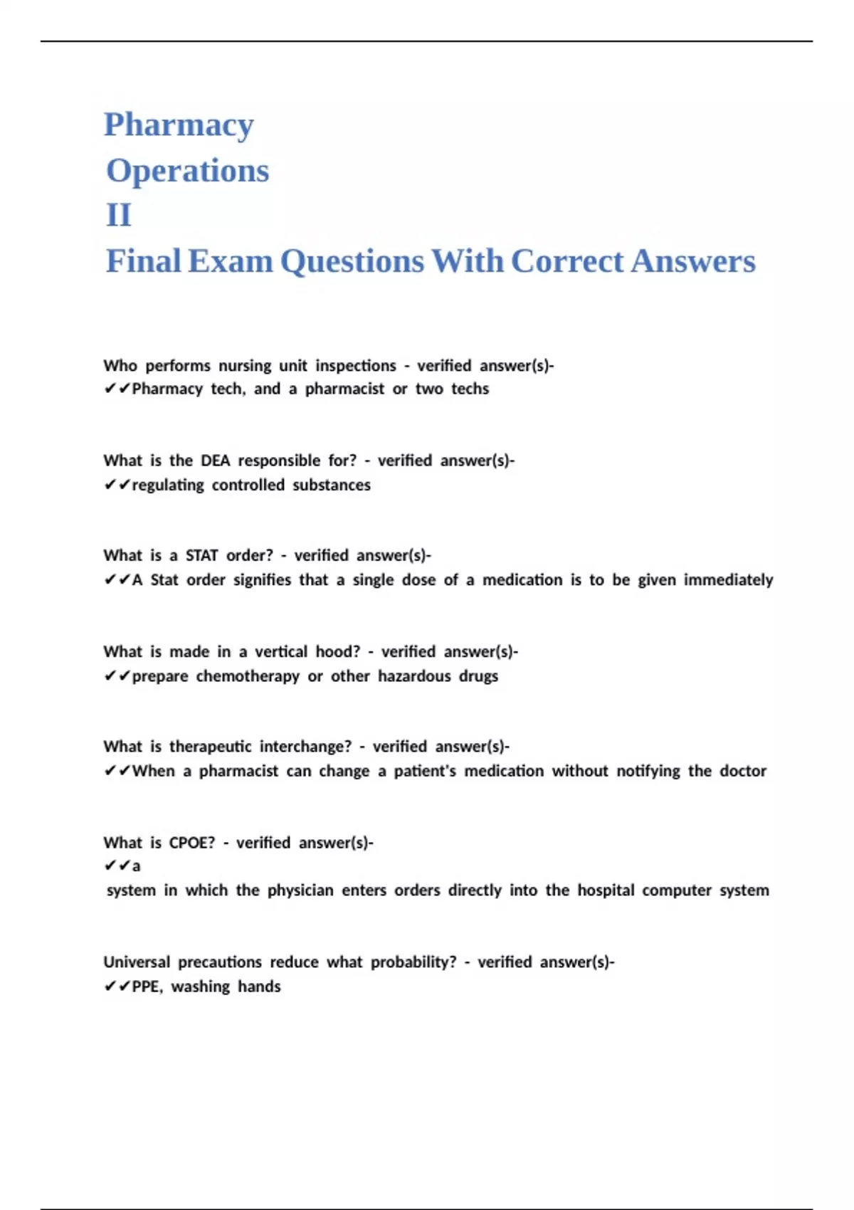 Pharmacy Operations II Final Exam Questions With Correct Answers.