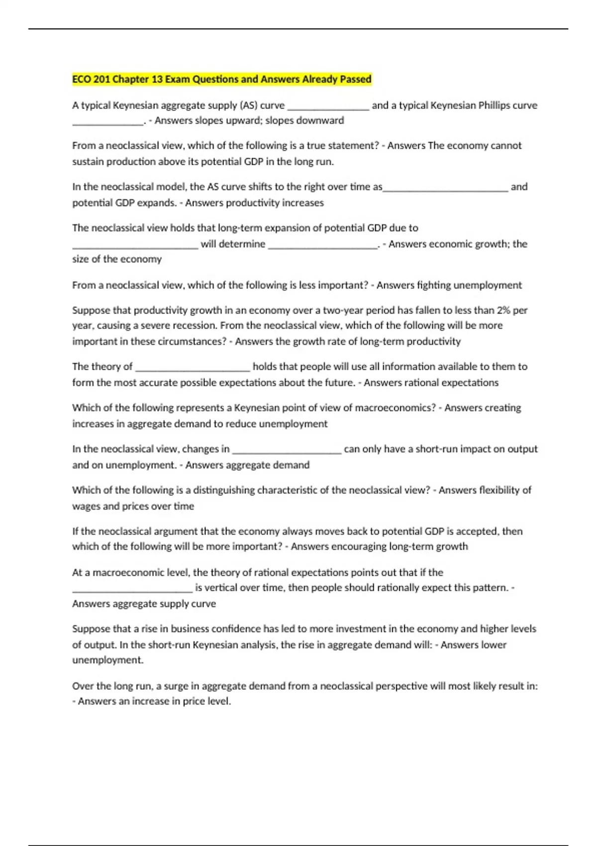 ECO 201 Chapter 13 Exam Questions and Answers Already Passed A typical Keynesian aggregate supply (AS) curve _______________ and a typical Keynesian Phillips curve _____________. - Answers slopes upward; slopes downward From a neoclassical view, which of the following is a true statement? - Answers The economy cannot sustain production above its potential GDP in the long run. In the neoclassical model, the AS curve shifts to the right over time as_______________________ and potential GDP expands. - Answers productivity increases The neoclassical view holds that long-term expansion of potential GDP due to _______________________ will determine ____________________. - Answers economic growth; the size of the economy From a neoclassical view, which of the following is less important? - Answers fighting unemployment Suppose that productivity growth in an economy over a two-year period has fallen to less than 2% per year, causing a severe recession. From the neoclassical view, which of the following will be more important in these circumstances? - Answers the growth rate of long-term productivity The theory of _____________________ holds that people will use all information available to them to form the most accurate possible expectations about the future. - Answers rational expectations Which of the following represents a Keynesian point of view of macroeconomics? - Answers creating increases in aggregate demand to reduce unemployment In the neoclassical view, changes in ____________________ can only have a short-run impact on output and on unemployment. - Answers aggregate demand Which of the following is a distinguishing characteristic of the neoclassical view? - Answers flexibility of wages and prices over time If the neoclassical argument that the economy always moves back to potential GDP is accepted, then which of the following will be more important? - Answers encouraging long-term growth At a macroeconomic level, the theory of rational expectations points out that if the ______________________ is vertical over time, then people should rationally expect this pattern. - Answers aggregate supply curve