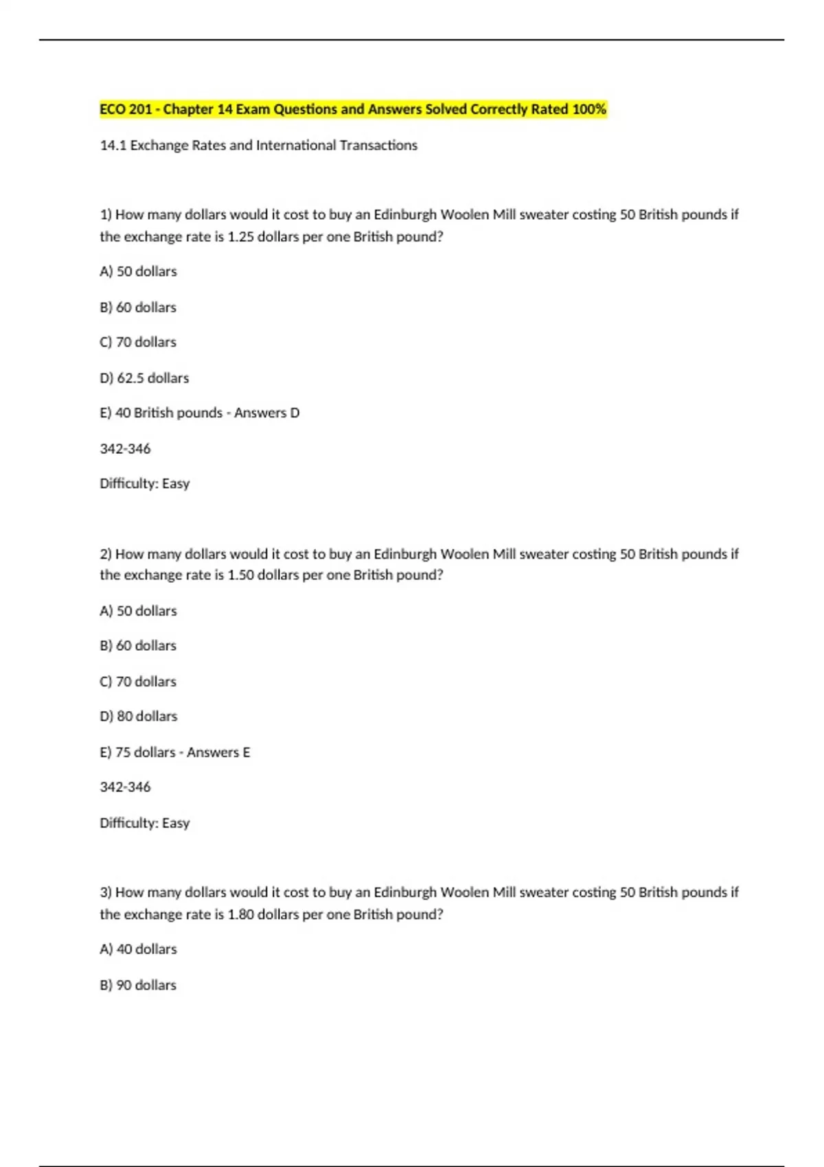 ECO 201 - Chapter 14 Exam Questions and Answers Solved Correctly Rated 100% 14.1 Exchange Rates and International Transactions 1) How many dollars would it cost to buy an Edinburgh Woolen Mill sweater costing 50 British pounds if the exchange rate is 1.25 dollars per one British pound? A) 50 dollars B) 60 dollars C) 70 dollars D) 62.5 dollars E) 40 British pounds - Answers D 342-346 Difficulty: Easy 2) How many dollars would it cost to buy an Edinburgh Woolen Mill sweater costing 50 British pounds if the exchange rate is 1.50 dollars per one British pound? A) 50 dollars B) 60 dollars C) 70 dollars D) 80 dollars E) 75 dollars - Answers E 342-346 Difficulty: Easy 3) How many dollars would it cost to buy an Edinburgh Woolen Mill sweater costing 50 British pounds if the exchange rate is 1.80 dollars per one British pound? A) 40 dollars B) 90 dollars C) 50 dollars D) 100 dollars E) 95 dollars - Answers B 342-346 Difficulty: Easy 4) The Japanese currency is called the A) DM. B) Yen. C) Euro. D) Dollar. E) Pound. - Answers B 342-346 Difficulty: Easy 5) How many British pounds would it cost to buy a pair of American designer jeans costing $45 if the exchange rate is 1.50 dollars per British pound? A) 10 British pounds B) 20 British pounds C) 30 British pounds D) 35 British pounds E) 25 British pounds - Answers C 342-346 Difficulty: Easy 6) How many British pounds would it cost to buy a pair of American designer jeans costing $45 if the exchange rate is 1.80 dollars per British pound?
