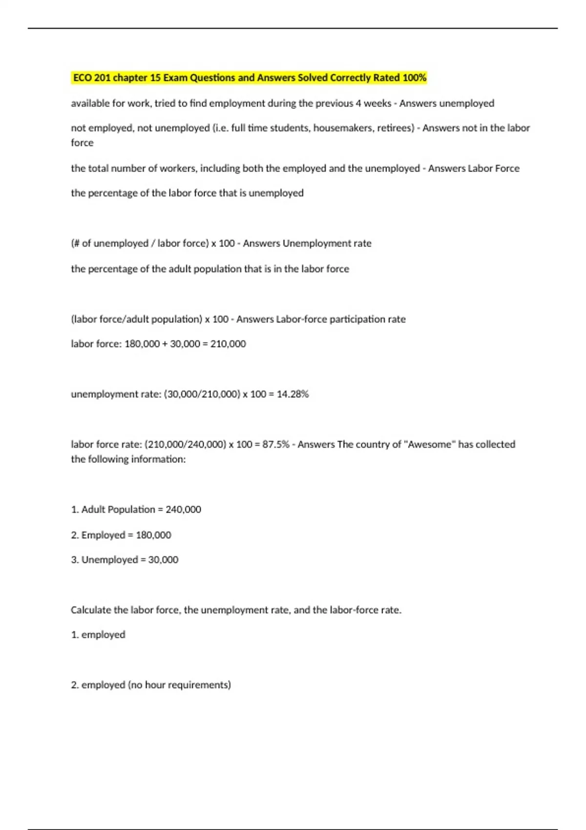 ECO 201 chapter 15 Exam Questions and Answers Solved Correctly Rated 100% available for work, tried to find employment during the previous 4 weeks - Answers unemployed not employed, not unemployed (i.e. full time students, housemakers, retirees) - Answers not in the labor force the total number of workers, including both the employed and the unemployed - Answers Labor Force the percentage of the labor force that is unemployed (# of unemployed / labor force) x 100 - Answers Unemployment rate the percentage of the adult population that is in the labor force (labor force/adult population) x 100 - Answers Labor-force participation rate labor force: 180,000 + 30,000 = 210,000 unemployment rate: (30,000/210,000) x 100 = 14.28% labor force rate: (210,000/240,000) x 100 = 87.5% - Answers The country of "Awesome" has collected the following information: 1. Adult Population = 240,000 2. Employed = 180,000 3. Unemployed = 30,000 Calculate the labor force, the unemployment rate, and the labor-force rate. 1. employed 2. employed (no hour requirements) 3. unemployed 4. not in labor force - Answers Classify each of the following individuals in one of the following categories: employed,unemployed, or not in the labor force. 1.Steve worked 40 hours last week in an office supply store. 2. Last week, Elizabeth worked 10 hours as a computer programmer for the National Video Company and attended night classes at the local college. She would prefer a full-time job. 3. Roger lost his job at the R-gone Manufacturing Company. Since then he has been trying to find a job at other local factories. 4. Linda is a homemaker. Last week she was occupied with her normal household chores. She neither helda job nor looked for a job.Chapter 15: Unemployment A. not in the labor force B. employeed C. not in the labor force - Answers Classify each of the following individuals in one of the following categories: employed,unemployed, or not in the labor force.