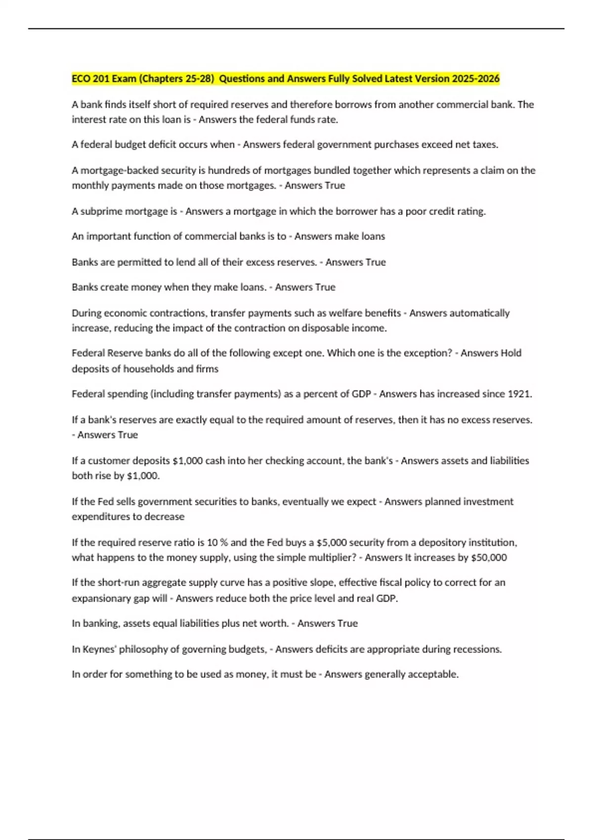 ECO 201 Exam (Chapters 25-28) Questions and Answers Fully Solved Latest Version A bank finds itself short of required reserves and therefore borrows from another commercial bank. The interest rate on this loan is - Answers the federal funds rate. A federal budget deficit occurs when - Answers federal government purchases exceed net taxes. A mortgage-backed security is hundreds of mortgages bundled together which represents a claim on the monthly payments made on those mortgages. - Answers True A subprime mortgage is - Answers a mortgage in which the borrower has a poor credit rating. An important function of commercial banks is to - Answers make loans Banks are permitted to lend all of their excess reserves. - Answers True Banks create money when they make loans. - Answers True During economic contractions, transfer payments such as welfare benefits - Answers automatically increase, reducing the impact of the contraction on disposable income. Federal Reserve banks do all of the following except one. Which one is the exception? - Answers Hold deposits of households and firms Federal spending (including transfer payments) as a percent of GDP - Answers has increased since 1921. If a bank's reserves are exactly equal to the required amount of reserves, then it has no excess reserves. - Answers True If a customer deposits $1,000 cash into her checking account, the bank's - Answers assets and liabilities both rise by $1,000. If the Fed sells government securities to banks, eventually we expect - Answers planned investment expenditures to decrease If the required reserve ratio is 10 % and the Fed buys a $5,000 security from a depository institution, what happens to the money supply, using the simple multiplier? - Answers It increases by $50,000 If the short-run aggregate supply curve has a positive slope, effective fiscal policy to correct for an expansionary gap will - Answers reduce both the price level and real GDP. In banking, assets equal liabilities plus net worth. - Answers True In Keynes' philosophy of governing budgets, - Answers deficits are appropriate during recessions. In order for something to be used as money, it must be - Answers generally acceptable.