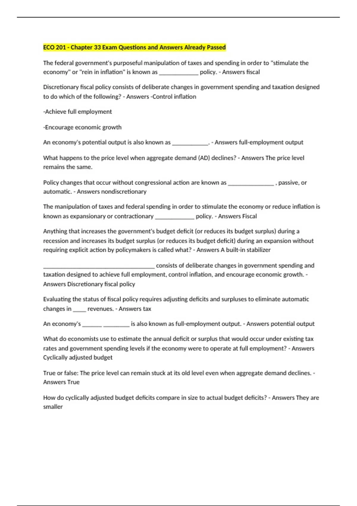 ECO 201 - Chapter 33 Exam Questions and Answers Already Passed The federal government's purposeful manipulation of taxes and spending in order to "stimulate the economy" or "rein in inflation" is known as ____________ policy. - Answers fiscal Discretionary fiscal policy consists of deliberate changes in government spending and taxation designed to do which of the following? - Answers -Control inflation -Achieve full employment -Encourage economic growth An economy's potential output is also known as ___________. - Answers full-employment output What happens to the price level when aggregate demand (AD) declines? - Answers The price level remains the same. Policy changes that occur without congressional action are known as ______________ , passive, or automatic. - Answers nondiscretionary The manipulation of taxes and federal spending in order to stimulate the economy or reduce inflation is known as expansionary or contractionary ____________ policy. - Answers Fiscal Anything that increases the government's budget deficit (or reduces its budget surplus) during a recession and increases its budget surplus (or reduces its budget deficit) during an expansion without requiring explicit action by policymakers is called what? - Answers A built-in stabilizer __________________________________ consists of deliberate changes in government spending and taxation designed to achieve full employment, control inflation, and encourage economic growth. - Answers Discretionary fiscal policy Evaluating the status of fiscal policy requires adjusting deficits and surpluses to eliminate automatic changes in ____ revenues. - Answers tax An economy's ______ ________ is also known as full-employment output. - Answers potential output What do economists use to estimate the annual deficit or surplus that would occur under existing tax rates and government spending levels if the economy were to operate at full employment? - Answers Cyclically adjusted budget True or false: The price level can remain stuck at its old level even when aggregate demand declines. - Answers True How do cyclically adjusted budget deficits compare in size to actual budget deficits? - Answers They are smaller Which of the following are used to describe policy changes that occur without congressional action? - Answers -Nondiscretionary -Automatic -Passive The economy strengthened and real _________ grew between 2003 and 2007. - Answers GDP _ _____ __ _________ is anything that increases the government's budget deficit (or reduces its