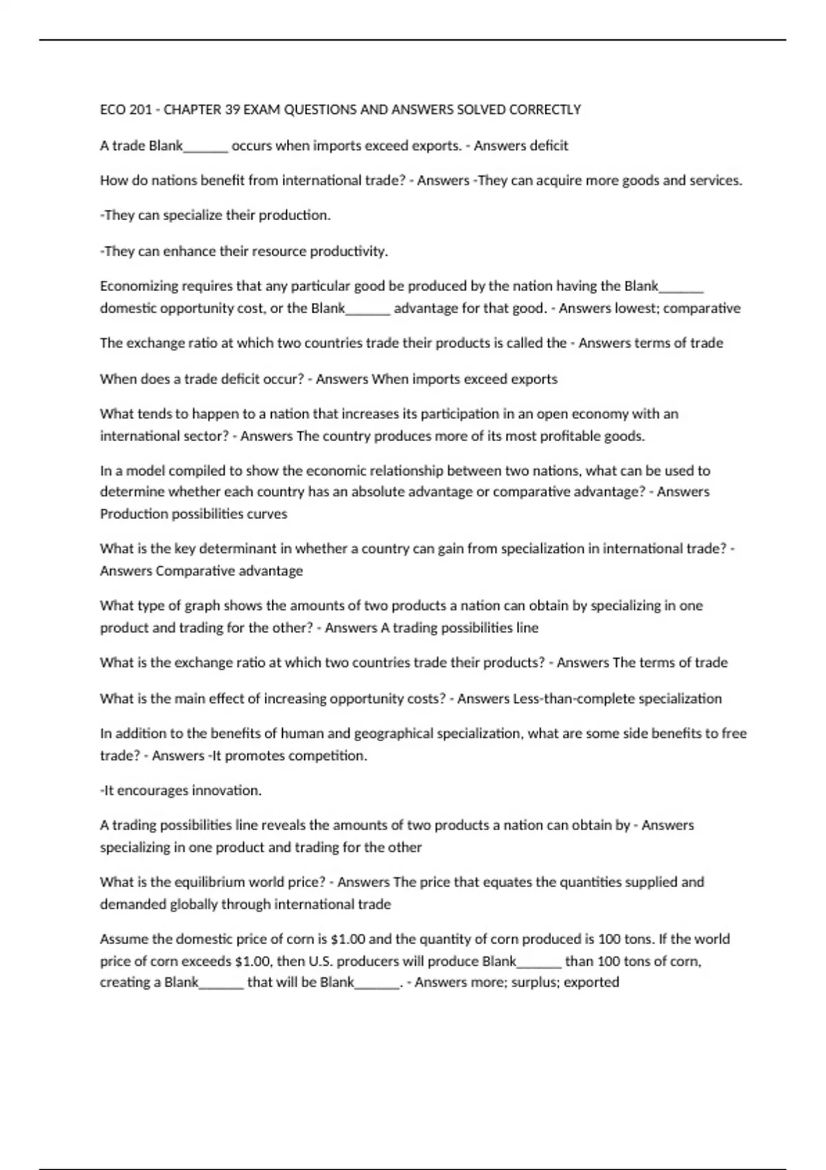 ECO 201 - CHAPTER 39 EXAM QUESTIONS AND ANSWERS SOLVED CORRECTLY A trade Blank______ occurs when imports exceed exports. - Answers deficit How do nations benefit from international trade? - Answers -They can acquire more goods and services. -They can specialize their production. -They can enhance their resource productivity. Economizing requires that any particular good be produced by the nation having the Blank______ domestic opportunity cost, or the Blank______ advantage for that good. - Answers lowest; comparative The exchange ratio at which two countries trade their products is called the - Answers terms of trade When does a trade deficit occur? - Answers When imports exceed exports What tends to happen to a nation that increases its participation in an open economy with an international sector? - Answers The country produces more of its most profitable goods. In a model compiled to show the economic relationship between two nations, what can be used to determine whether each country has an absolute advantage or comparative advantage? - Answers Production possibilities curves What is the key determinant in whether a country can gain from specialization in international trade? - Answers Comparative advantage What type of graph shows the amounts of two products a nation can obtain by specializing in one product and trading for the other? - Answers A trading possibilities line What is the exchange ratio at which two countries trade their products? - Answers The terms of trade What is the main effect of increasing opportunity costs? - Answers Less-than-complete specialization In addition to the benefits of human and geographical specialization, what are some side benefits to free trade? - Answers -It promotes competition. -It encourages innovation. A trading possibilities line reveals the amounts of two products a nation can obtain by - Answers specializing in one product and trading for the other What is the equilibrium world price? - Answers The price that equates the quantities supplied and demanded globally through international trade Assume the domestic price of corn is $1.00 and the quantity of corn produced is 100 tons. If the world price of corn exceeds $1.00, then U.S. producers will produce Blank______ than 100 tons of corn, creating a Blank______ that will be Blank______. - Answers more; surplus; exported In a two-nation model, international equilibrium is determined by the Blank______ of one country and the Blank______ of the other country. - Answers import demand, export supply The interaction of world supply and demand determines the equilibrium - Answers world price What is a tariff? - Answers A tax on an imported good What are the four direct effects of a tariff? - Answers -A decline in consumption -Tariff revenue -A decline in imports -Increased domestic production What is the main economic difference between a tariff and a quota? - Answers A tariff generates revenue for the domestic government. The intersection of one nation's import demand curve and another nation's export supply curve represents - Answers international equilibrium Tariffs and/or quotas tend to result in Blank______ for domestic consumers and Blank______ for the producers of the protected goods in the importing economy. - Answers costs; gains A tariff imposed on Chinese imports into the United States tends to - Answers benefit U.S. producers and penalize Chinese producers What are the three basic principles of the General Agreement on Tariffs and Trade (GATT)? - Answers -Reduce tariffs, using multilateral negotiations. -Equal, nondiscriminatory treatment of members. -Eliminate import quotas. Which statements about tariffs and quotas are true? - Answers -A quota transfers revenue to foreign producers. -A quota does not generate revenue for the government. -A tariff generates revenue for the domestic government. What institution is in charge of overseeing trade agreements and ruling on disputes relating to