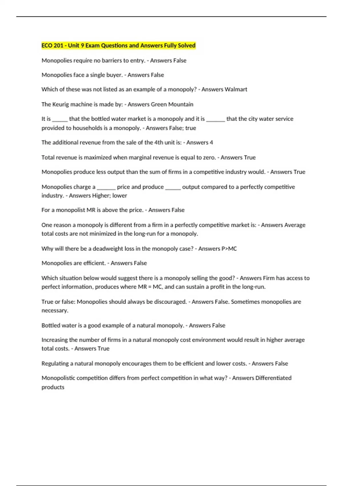 ECO 201 - Unit 9 Exam Questions and Answers Fully Solved Monopolies require no barriers to entry. - Answers False Monopolies face a single buyer. - Answers False Which of these was not listed as an example of a monopoly? - Answers Walmart The Keurig machine is made by: - Answers Green Mountain It is _____ that the bottled water market is a monopoly and it is ______ that the city water service provided to households is a monopoly. - Answers False; true The additional revenue from the sale of the 4th unit is: - Answers 4 Total revenue is maximized when marginal revenue is equal to zero. - Answers True Monopolies produce less output than the sum of firms in a competitive industry would. - Answers True Monopolies charge a ______ price and produce _____ output compared to a perfectly competitive industry. - Answers Higher; lower For a monopolist MR is above the price. - Answers False One reason a monopoly is different from a firm in a perfectly competitive market is: - Answers Average total costs are not minimized in the long-run for a monopoly. Why will there be a deadweight loss in the monopoly case? - Answers P>MC