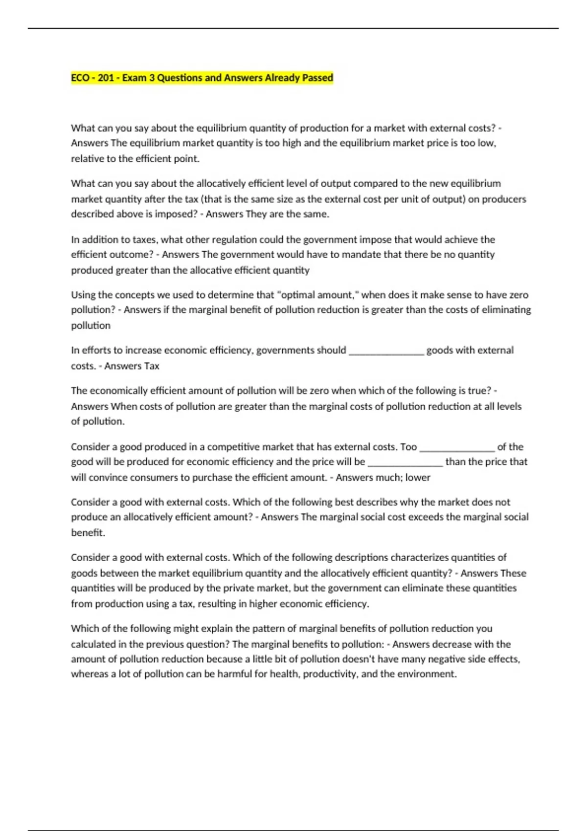 ECO - 201 - Exam 3 Questions and Answers Already Passed What can you say about the equilibrium quantity of production for a market with external costs? - Answers The equilibrium market quantity is too high and the equilibrium market price is too low, relative to the efficient point. What can you say about the allocatively efficient level of output compared to the new equilibrium market quantity after the tax (that is the same size as the external cost per unit of output) on producers described above is imposed? - Answers They are the same. In addition to taxes, what other regulation could the government impose that would achieve the efficient outcome? - Answers The government would have to mandate that there be no quantity produced greater than the allocative efficient quantity Using the concepts we used to determine that "optimal amount," when does it make sense to have zero pollution? - Answers if the marginal benefit of pollution reduction is greater than the costs of eliminating pollution In efforts to increase economic efficiency, governments should ______________ goods with external costs. - Answers Tax The economically efficient amount of pollution will be zero when which of the following is true? - Answers When costs of pollution are greater than the marginal costs of pollution reduction at all levels of pollution. Consider a good produced in a competitive market that has external costs. Too ______________ of the good will be produced for economic efficiency and the price will be ______________ than the price that will convince consumers to purchase the efficient amount. - Answers much; lower Consider a good with external costs. Which of the following best describes why the market does not produce an allocatively efficient amount? - Answers The marginal social cost exceeds the marginal social benefit. Consider a good with external costs. Which of the following descriptions characterizes quantities of goods between the market equilibrium quantity and the allocatively efficient quantity? - Answers These quantities will be produced by the private market, but the government can eliminate these quantities from production using a tax, resulting in higher economic efficiency. Which of the following might explain the pattern of marginal benefits of pollution reduction you calculated in the previous question? The marginal benefits to pollution: - Answers decrease with the amount of pollution reduction because a little bit of pollution doesn't have many negative side effects, whereas a lot of pollution can be harmful for health, productivity, and the environment. Which of the following represents the efficient amount of pollution reduction given the marginal benefits the question two above and the marginal costs in the previous question of pollution reduction? You may need to generate a graph that includes both marginal costs and marginal benefits to answer this question. - Answers ~150,000 tons of pollution reduction Consider a good produced in a competitive market, but one with external benefits. The market price will result in too ______________ of the good for economic efficiency. The market price will be ______________ than the price that would convince producers to produce the efficient amount. - Answers Little; Lower Which of the following descriptions best characterizes public goods? - Answers Public goods are those where it is hard to keep non-payers from using the good, but their use of the good does not negatively impact others' ability to use it. Which of the following descriptions best characterizes common resources? - Answers Common resources are those where it is hard to keep non-payers from using the good, and their use of the good negatively impacts others' ability to use it. Which of these is an economically efficient manner of producing basic medical research? - Answers Either of these will work: Subsidize production of basic medical research by private producers or Government production of basic medical research Consider a good with external benefits. Which of the following best describes why the market does not produce an allocatively efficient amount? - Answers b The marginal private cost of production equals the marginal private benefit of production but is less than the marginal social benefit of production. You have been charged with deciding on optimal fishing policies in order to both encourage growth in the salmon population in the Atlantic and allow fishermen to earn a living. You will need to allow some fishing, but not so much fishing that population counts are depleted for next year. Three proposals are on the table for you to choose from.