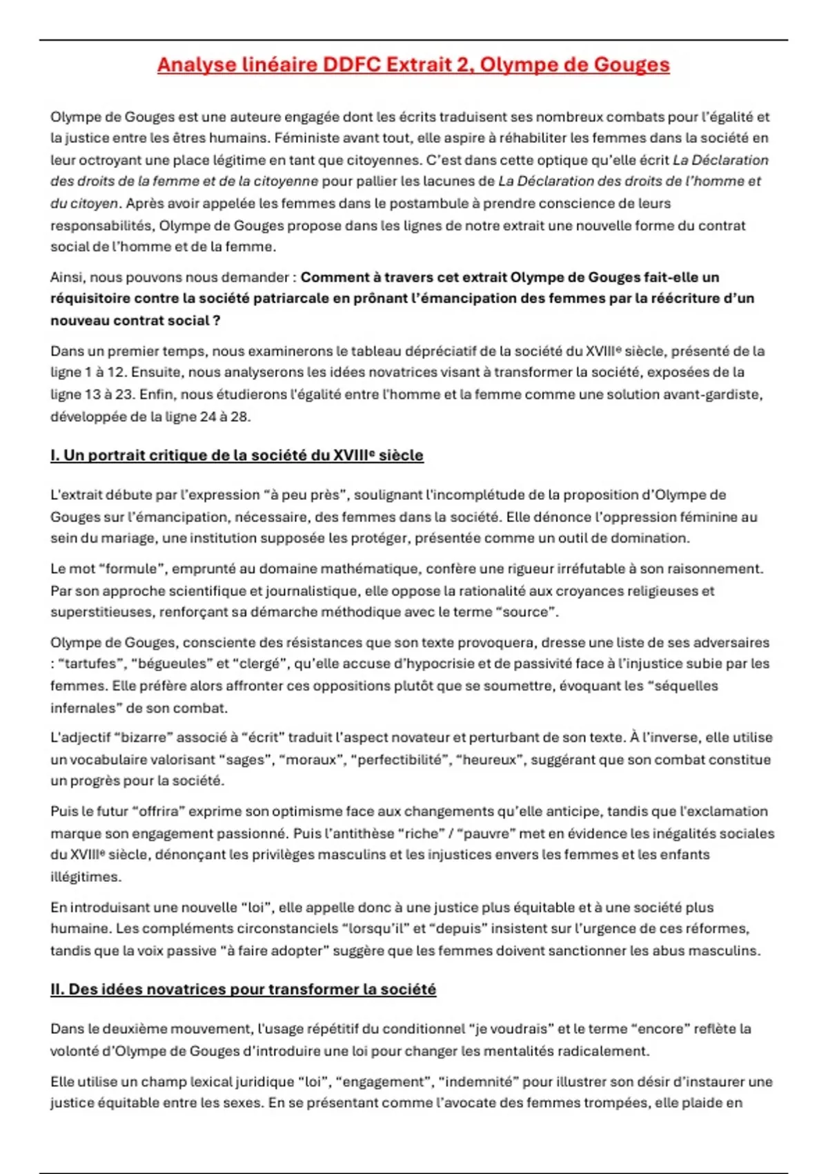 Je vous propose ici l'analyse linéaire rédigée d'un extrait de la DDFC d'Olympe de Gouges : Le contrat social. Vocabulaire précis, transitions fluides, temps parfait pour tenir à l'oral, procédés clairs et ouverture sur une autre oeuvre littéraire : tout ce qu'il vous faut pour exceller à l'épreuve si vous tomber sur cet extrait!