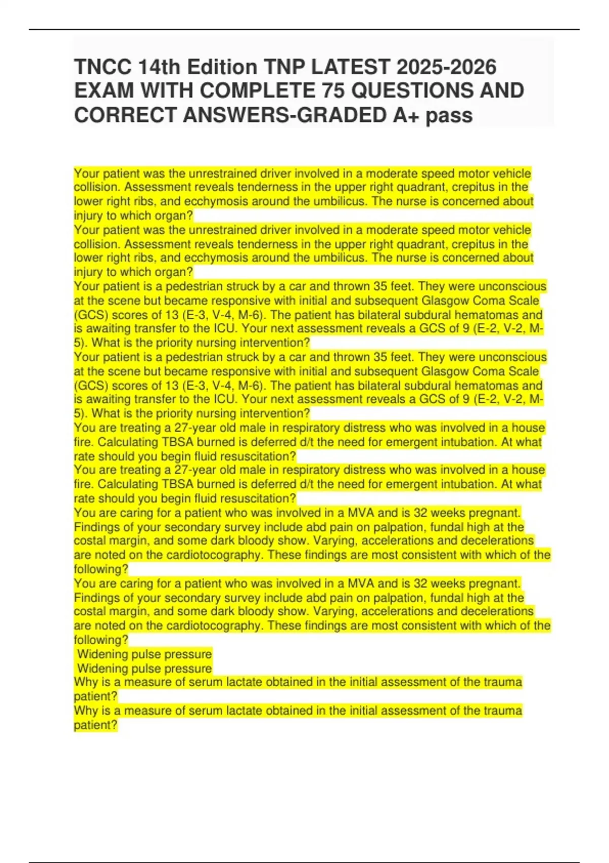 TNCC 9th Edition TNP LATEST EXAM WITH COMPLETE 75 QUESTIONS AND CORRECT