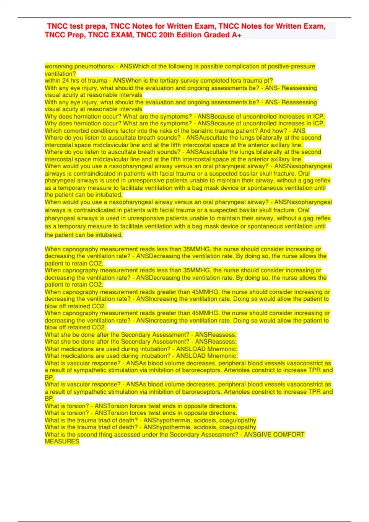 TNCC test prepa, TNCC Notes for Written Exam, TNCC Notes for Written Exam, TNCC Prep, TNCC EXAM,