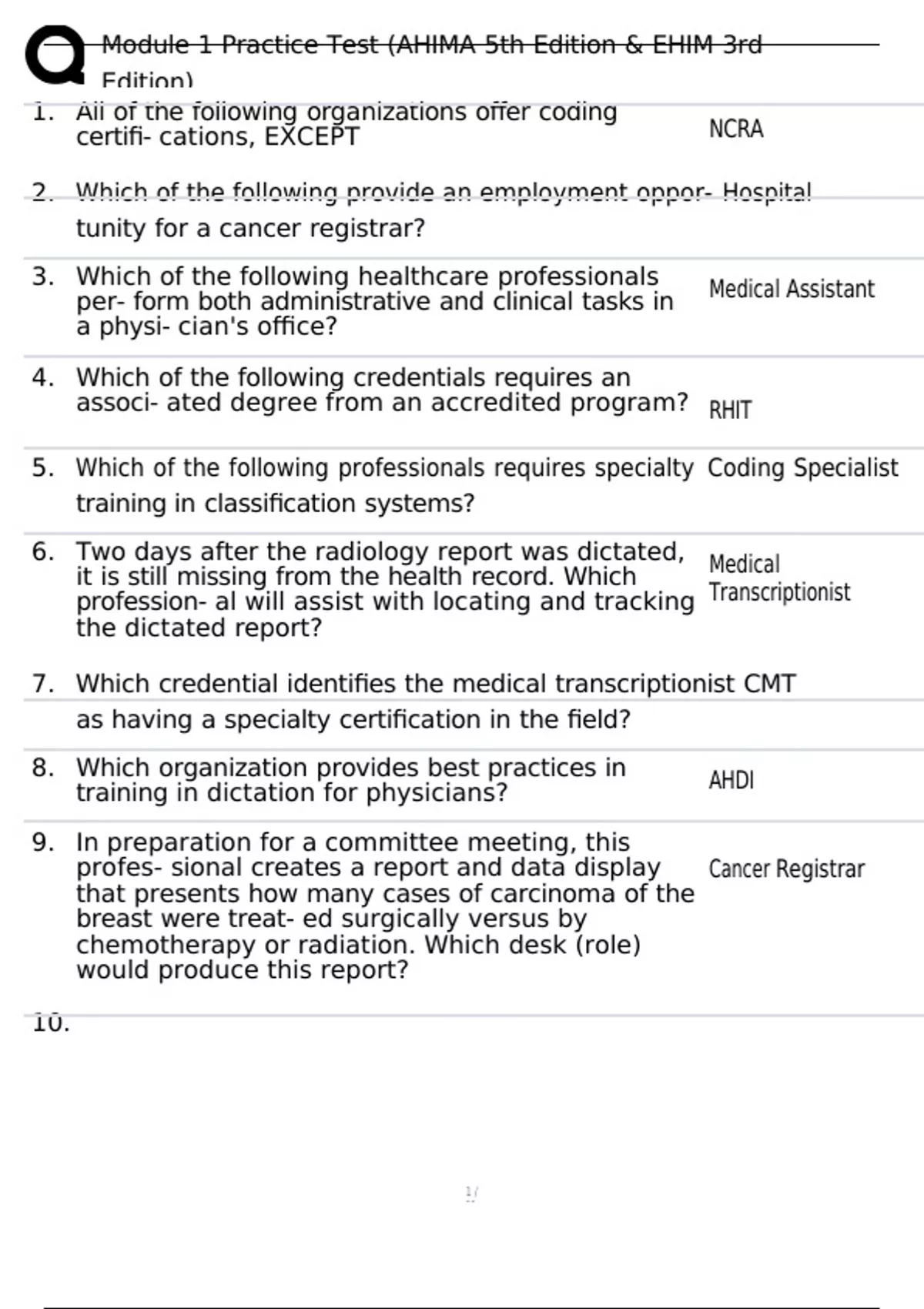 7. Which credential identifies the medical transcriptionist CMT
