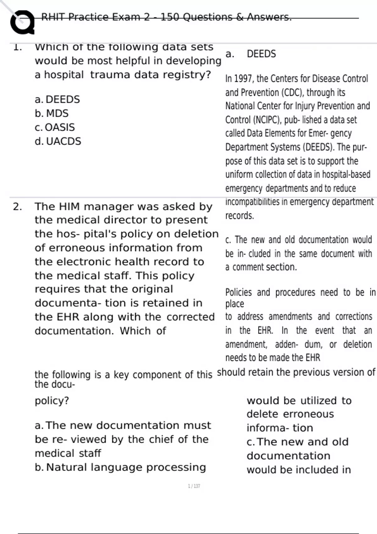 RHIT Practice Exam 2 - 150 Questions & Answers. 1. Which of the following data sets would be most helpful in developing a hospital trauma data registry? a. DEEDS b. MDS c. OASIS d. UACDS 2. The HIM manager was asked by the medical director to present the hos- pital's policy on deletion of erroneous information from the electronic health record to the medical staff. This policy requires that the original documenta- tion is retained in the EHR along with the corrected documentation. Which of a. DEEDS In 1997, the Centers for Disease Control and Prevention (CDC), through its National Center for Injury Prevention and Control (NCIPC), pub- lished a data set called Data Elements for Emer- gency Department Systems (DEEDS). The pur- pose of this data set is to support the uniform collection of data in hospital-based emergency departments and to reduce incompatibilities in emergency department records. c. The new and old documentation would be in- cluded in the same document with a comment section. Policies and procedures need to be in place to address amendments and corrections in the EHR. In the event that an amendment, adden- dum, or deletion needs to be made the EHR the following is a key component of this should retain the previous version of the docu- policy? a. The new documentation must be re- viewed by the chief of the medical staff b. Natural language processing would be utilized to delete erroneous informa- tion c. The new and old documentation would be included in the same docu- ment with a comment section. ment and identify who made the change along with the date and time that the change was made. d. The new documentation needs to be reviewed by the risk manager. 3. Which of the following can assist man- agers with the tasks of monitoring pro- ductivity and forecasting budgets? a. Intermediary bulletins b. Mapping errors c. Revenue codes d. Workload statistics 4. A dietary department donated its old laptop to a school. Some old patient data were still on the computer. What controls would have minimized this se- curity breach? a. Access controls b. Device and media controls c. Facility access controls d. Workstation controls 5. The coder assigned separate codes for individual tests when a combination d. Workload statistics Workload statistics can assist managers with the tasks of monitoring productivity and pro- vide data regarding resources used, such as equipment, personnel, services, and supplies. b. Device and media controls Device and media controls require the facili- ty to specify proper use of electronic media and devices (external drives, backup devices, etc.). Included in this requirement are controls and procedures regarding the receipt and re- moval of electronic media that contain protect- ed health information and the movement of such data within the facility. The entity must also address procedures for the transfer, removal, or disposal, including reuse or redeployment, of electronic media. d. Unbundling code exists. This is an example of which Unbundling occurs when individual compo- of the following? a. Upcoding b. Complex coding nents of a complete procedure or service are billed separately instead of using a combina- tion code.