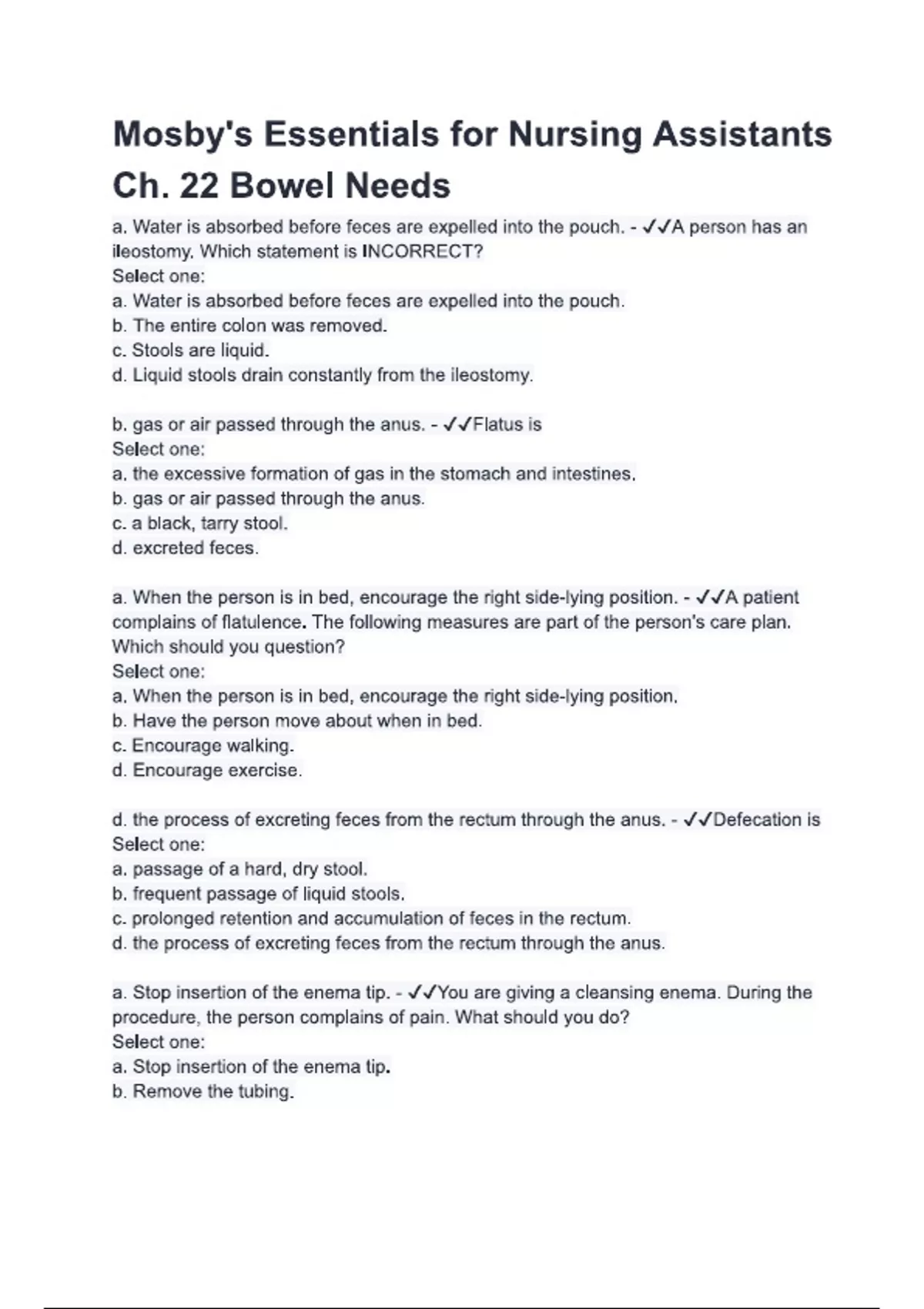 Mosby-s Essentials for Nursing Assistants Ch. 22 Bowel Needs questions and answers