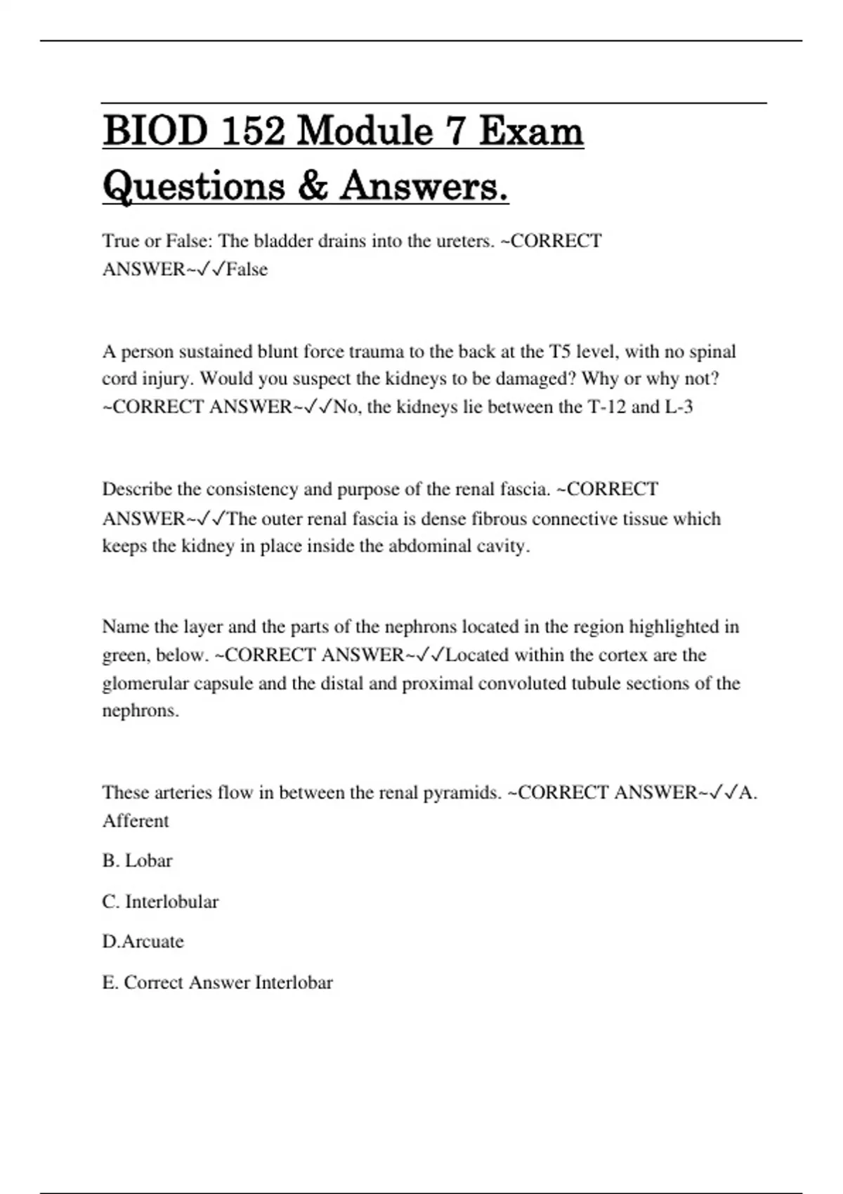 BIOD 152 Module 7 Exam Questions & Answers – Renal System, Nephron Function, Urinary Physiology