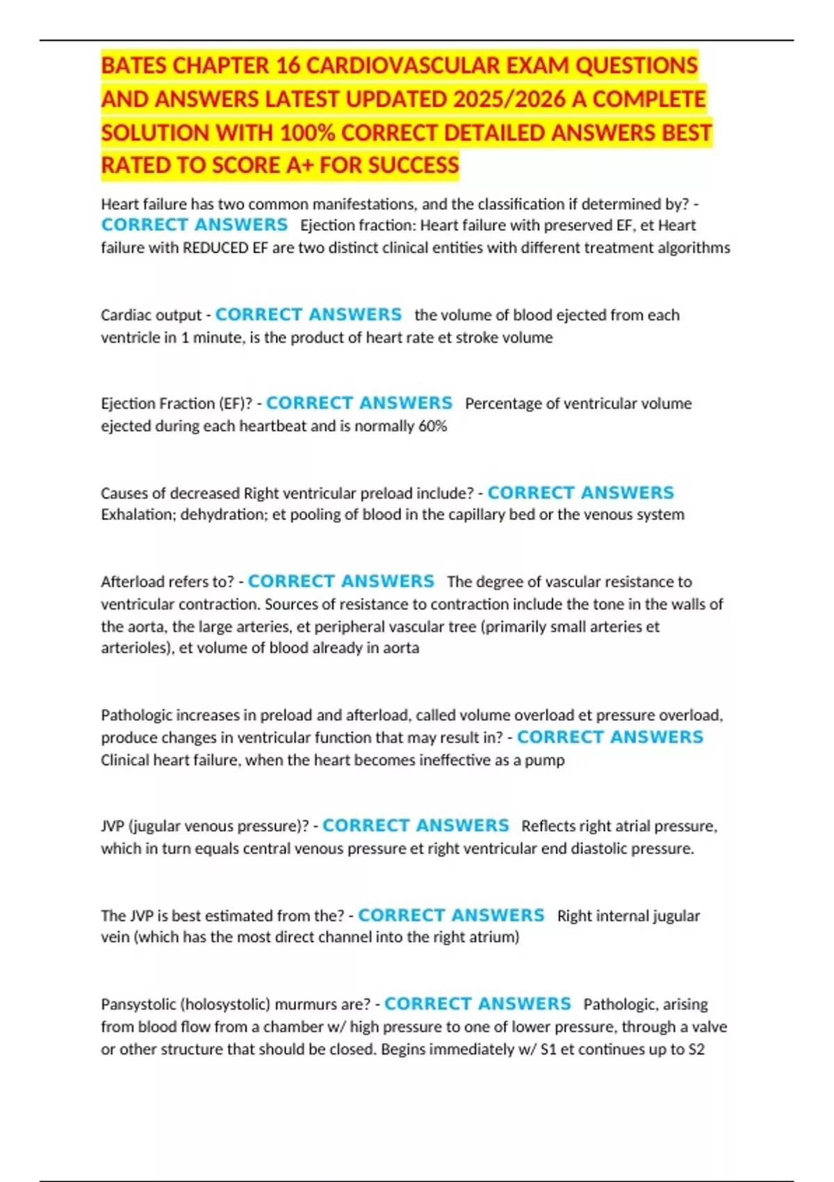 CORRECT ANSWERS Ejection fraction: Heart failure with preserved EF, et Heart