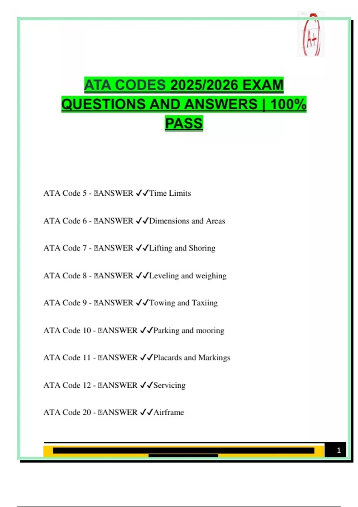 This document provides 85 verified and exam-ready ATA code questions and answers, tailored for the 2025/2026 Aviation Maintenance Technician (AMT) and Airframe & Powerplant (A&P) certification exams. It includes key code definitions and system categorizations used across aviation manuals, covering components such as airframe, propulsion, hydraulic systems, electrical power, avionics, cabin systems, and more. A concise and essential reference for aircraft maintenance students and professionals preparing for FAA or international aviation tests. Keywords: ATA codes, AMT exam, A&P certification, aviation maintenance, aircraft systems, ATA 100, airframe codes, engine systems, electrical systems, fuel systems, hydraulics, avionics, aircraft structures, rotorcraft systems, aviation reference guide, aircraft manual