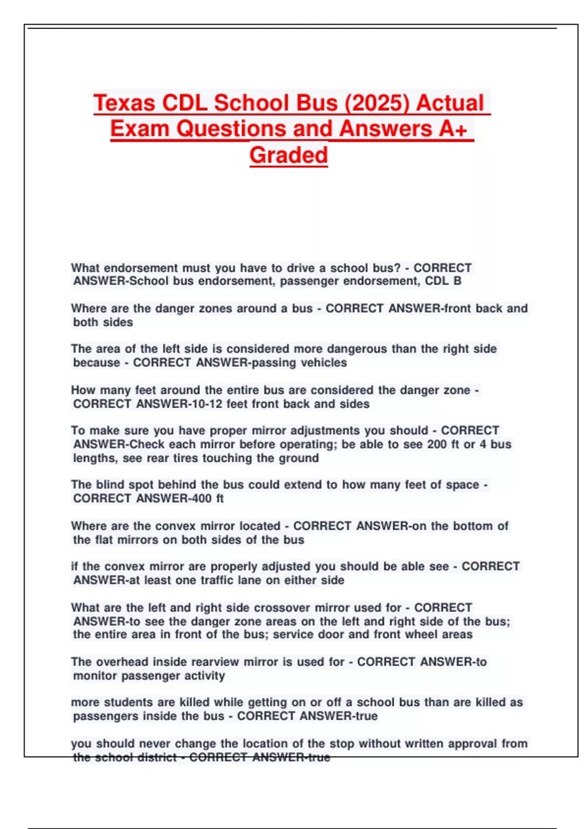 Texas CDL School Bus (2025) Actual Exam Questions and Answers A+ Graded.