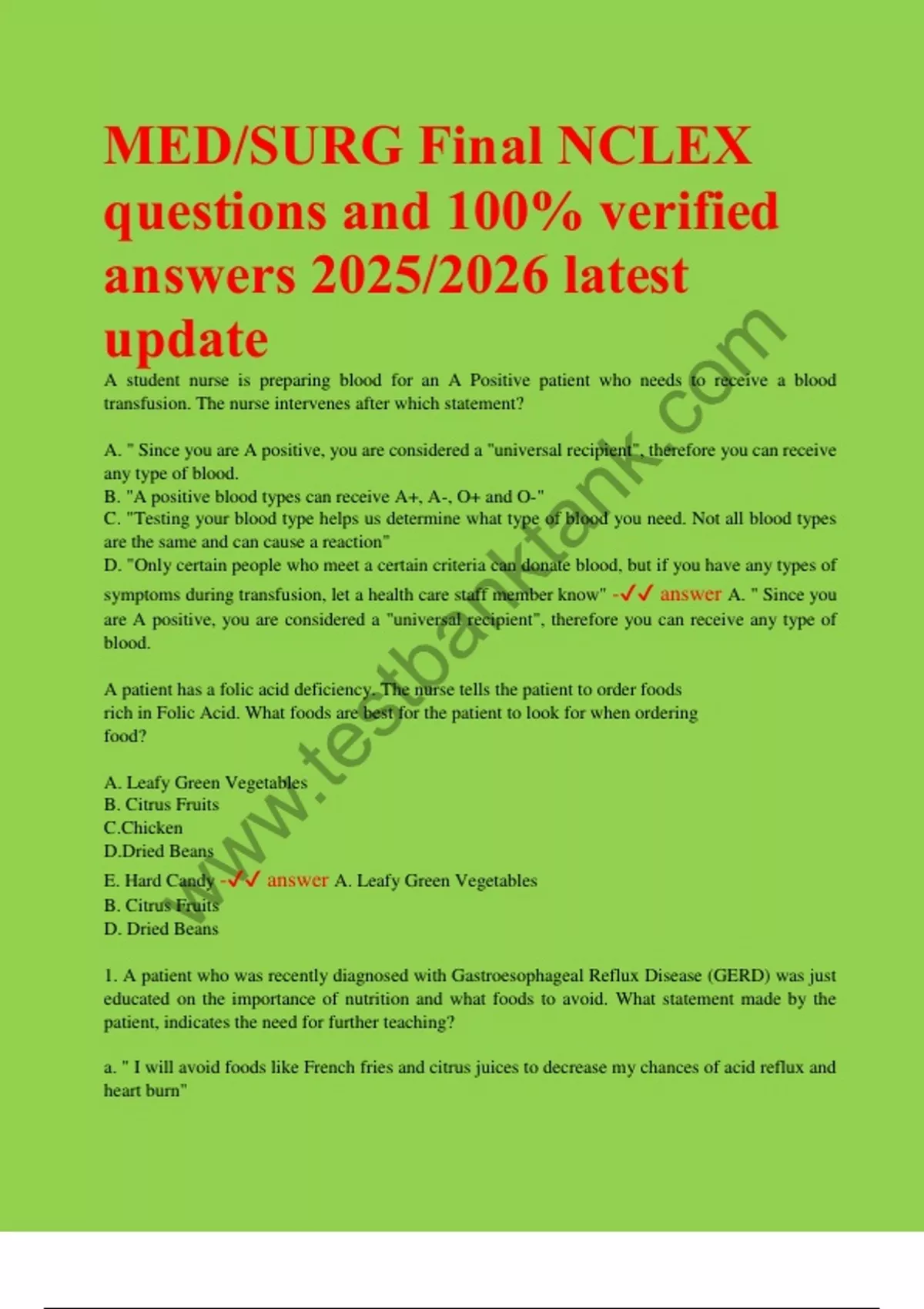 This 2026 updated Medical-Surgical Nursing Final NCLEX exam prep guide is a comprehensive collection of realistic, clinically-oriented, and 100% verified questions and answers designed to help nursing students master Med-Surg concepts and ace their final exam. Covering high-yield topics including cardiovascular, renal, endocrine, GI, respiratory, hematologic, and neurologic disorders, this document is ideal for NCLEX-RN® prep, final semester testing, or course revision. All answers are clearly marked with rationales and aligned with the latest Brunner & Suddarth’s Textbook of Medical-Surgical Nursing. Whether you’re a student from WGU, Chamberlain, Excelsior, or any ADN/BSN program, this document is a must-have tool for passing your Med-Surg class and preparing confidently for the NCLEX exam. Covers: Shock, Sepsis, Diabetes, CKD, Electrolytes, Acid-Base, GI Bleeds, Thyroid Disorders, Blood Transfusion Safety, IV Therapy, and more Verified answers with clinical rationales Updated for the 2025/2026 NCLEX test plan Designed to build confidence, accuracy, and speed on exam day