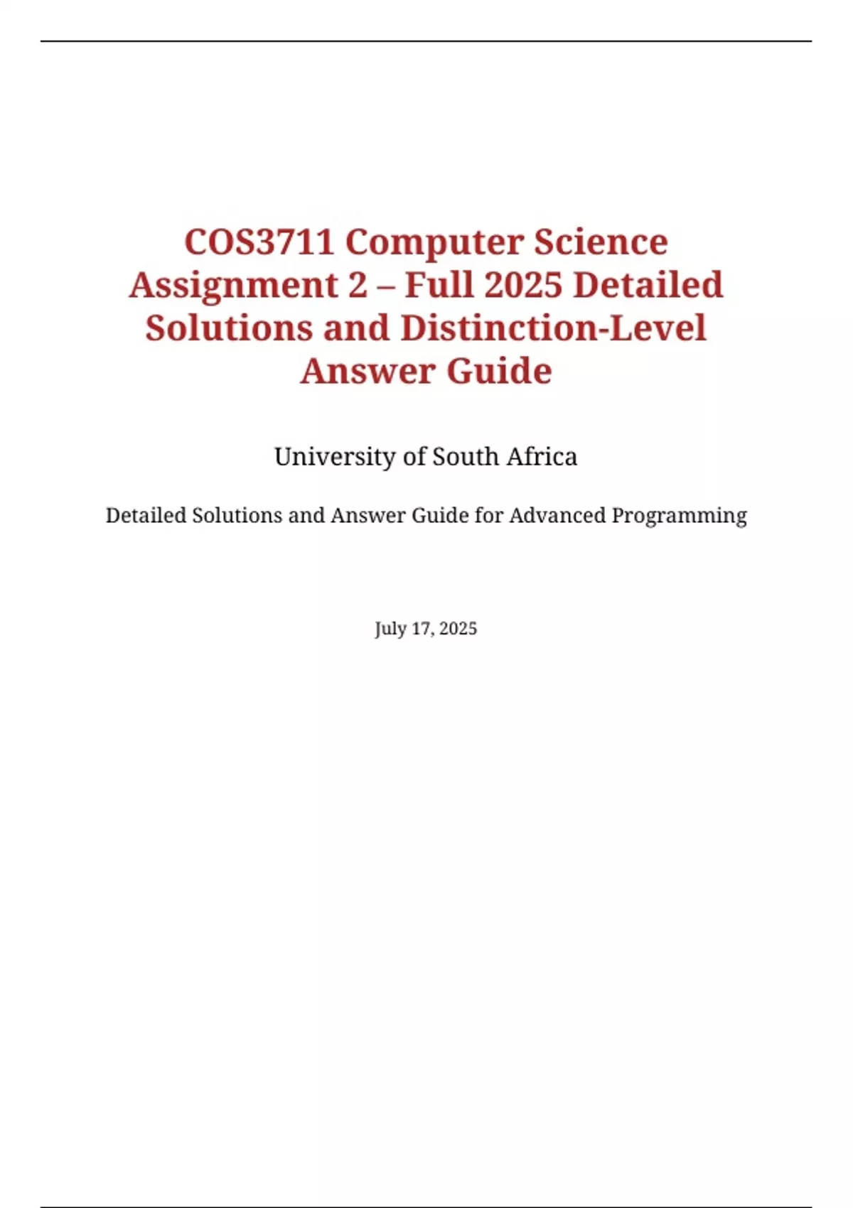 COS3711 Computer Science Assignment 2– Full 2025 Detailed Solutions and Distinction-Level Answer Guide University of South Africa Detailed Solutions and Answer Guide for Advanced Programming July 17, 2025 Introduction Thisdocumentprovidescomprehensivesolutionsandadistinction-levelanswer guideforCOS3711(Advanced Programming) Assignment2forthe2025 academic year. It includes refactored and expanded content with 100 detailed questions and answers, focusing on key C++ concepts such as object-oriented program ming, templates, exception handling, and memory management. Questions are highlighted in dark green for clarity, and answers are concise yet thorough, designed to meet distinction-level standards.