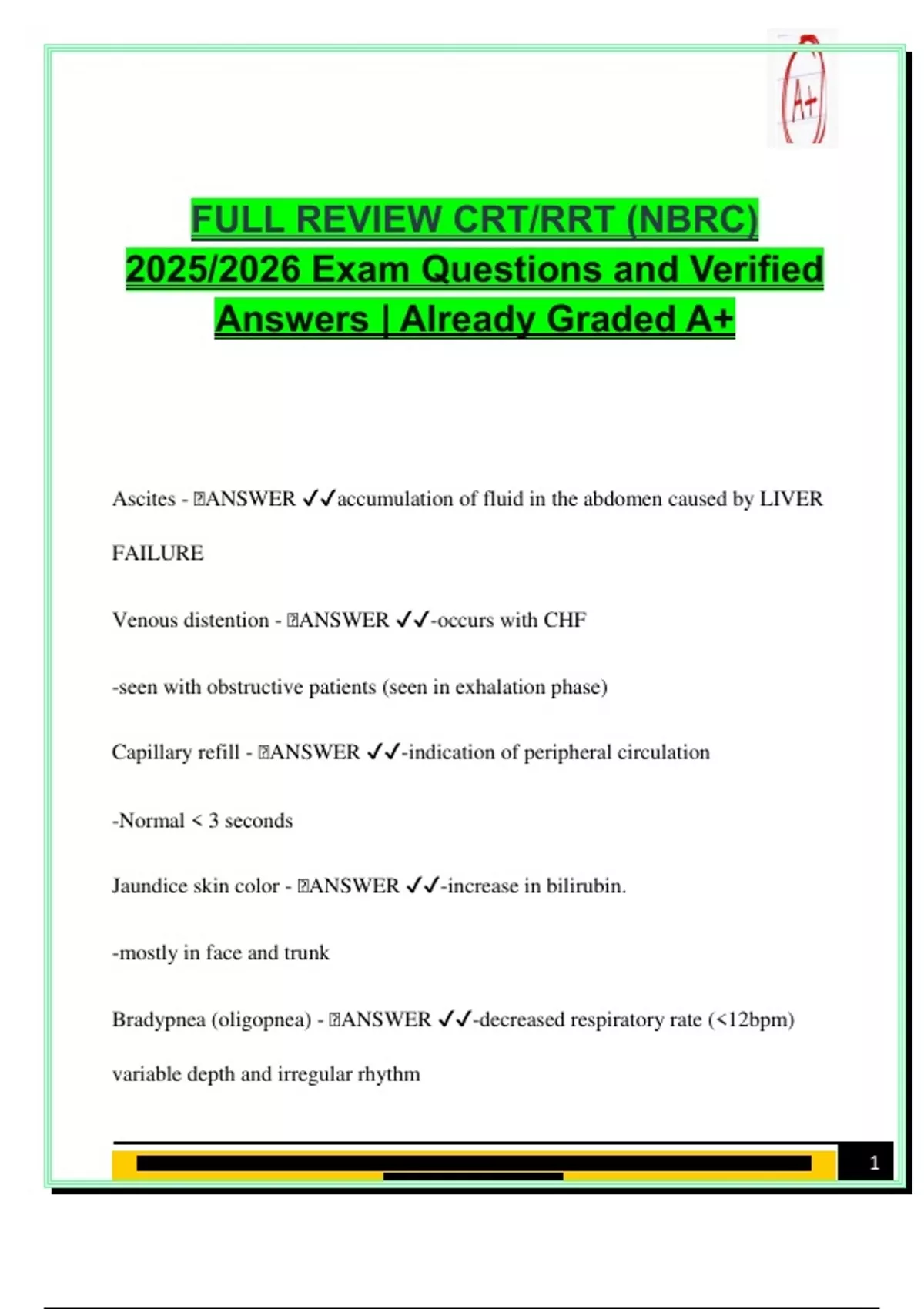 This complete CRT (Certified Respiratory Therapist) exam review for 2025/2026 features over 130 solved questions covering all major exam categories. Topics include arterial blood gases (ABGs), oxygen therapy delivery devices, mechanical ventilation modes and troubleshooting, airway clearance, suctioning, lung volumes, acid-base balance, breath sounds, respiratory pharmacology, and interpretation of chest x-rays and spirometry. Ideal for students preparing for the NBRC CRT credentialing exam. Keywords: CRT exam, ABG analysis, oxygen delivery, nasal cannula, non-rebreather, CPAP, BiPAP, mechanical ventilation, PEEP, tidal volume, FiO2, airway suctioning, intubation, tracheostomy, respiratory rate, breath sounds, crackles, wheezing, respiratory alkalosis, metabolic acidosis, lung compliance, vital capacity, inspiratory reserve, spirometry, chest x-ray interpretation, flow rate, pharmacology, bronchodilators, mucolytics, ventilator alarms, NBRC exam prep