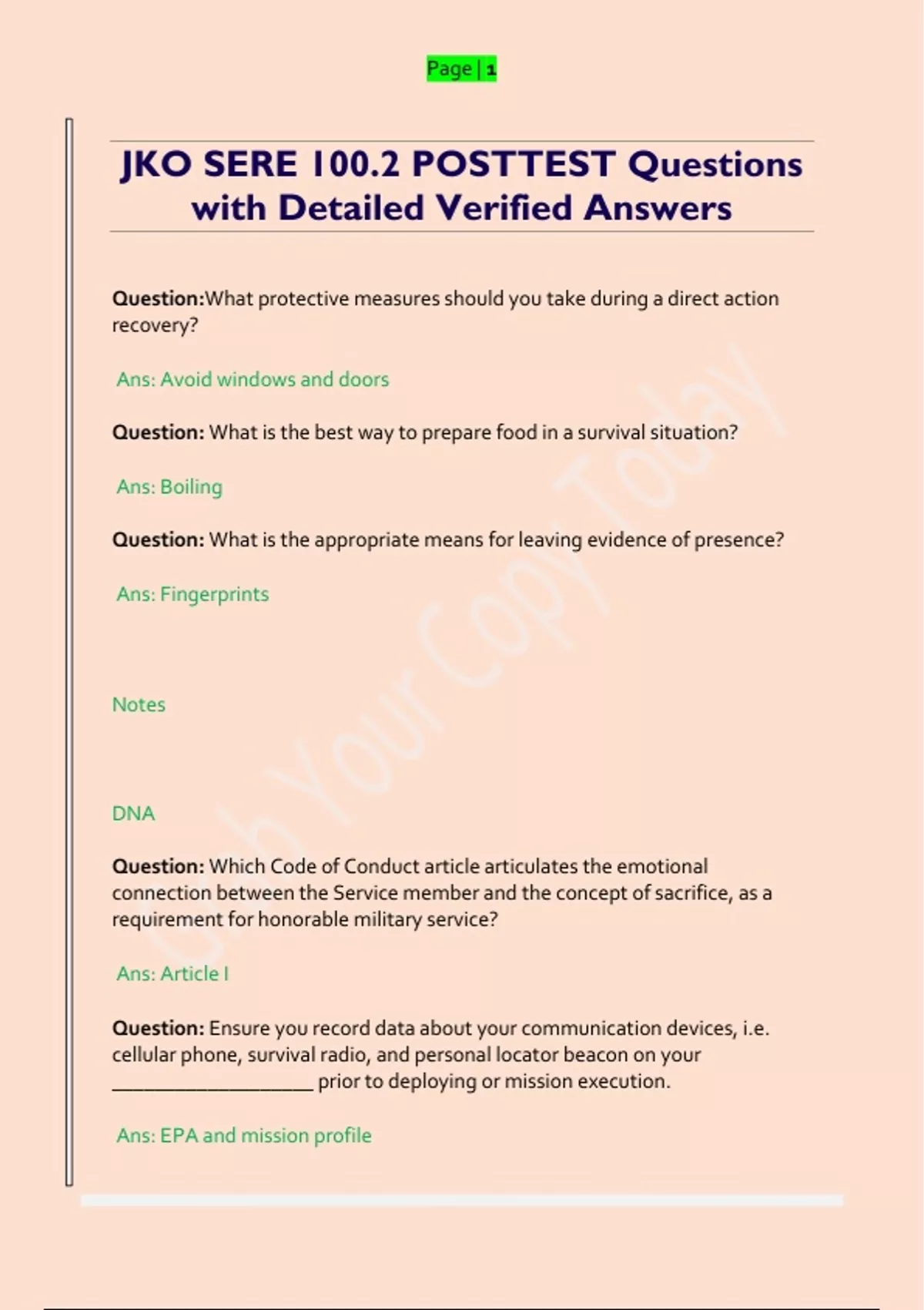 JKO SERE 100.2 POSTTEST Questions with Detailed Verified Answers JKO SERE 100.2 POSTTEST Questions with Detailed Verified Answers This resource includes the complete set of JKO SERE 100.2 posttest questions with detailed, verified answers. It is designed to support learners preparing for Survival, Evasion, Resistance, and Escape (SERE) certification requirements. Covers all exam objectives thoroughly.