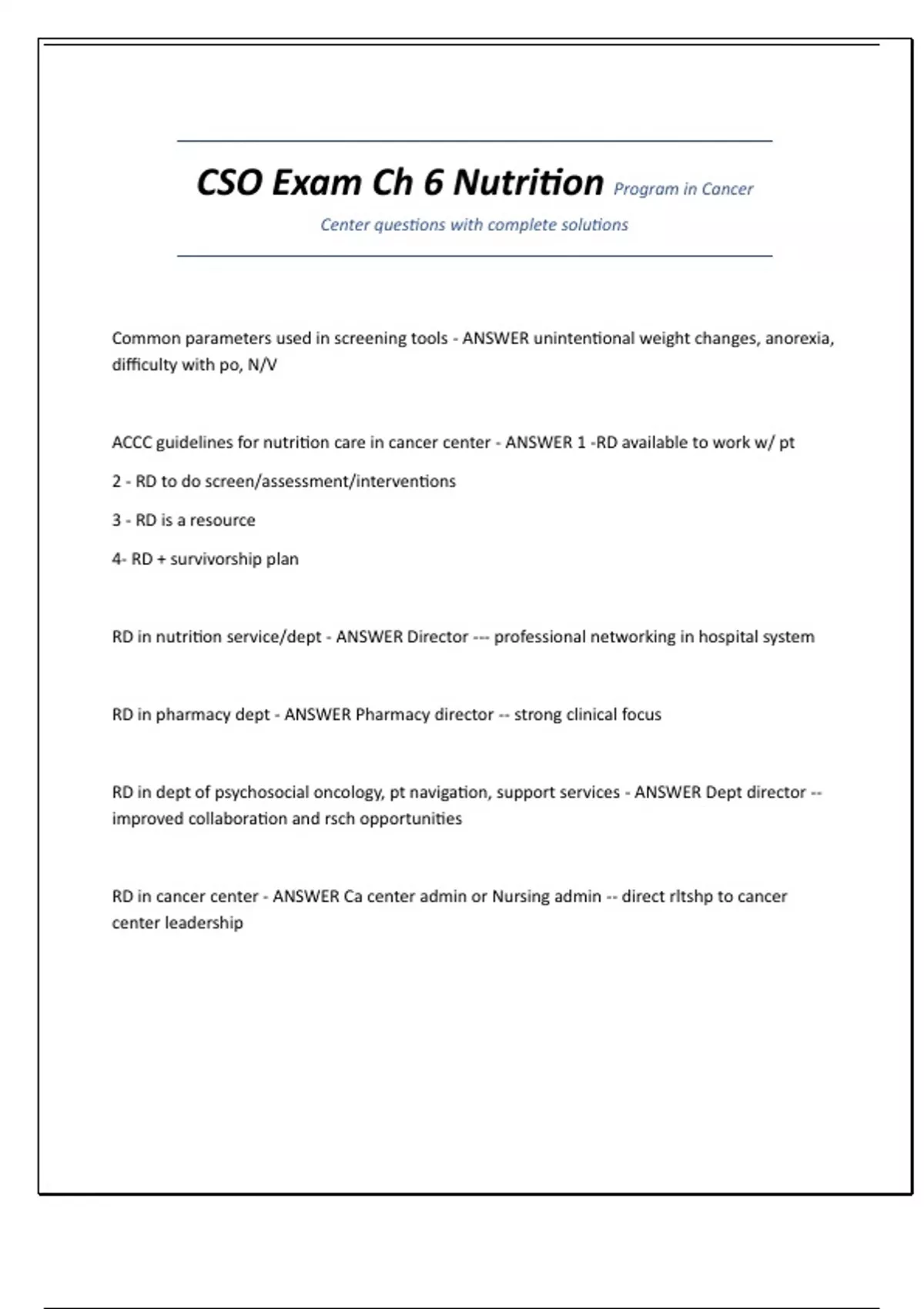 ACCC guidelines for nutrition care in cancer center - ANSWER 1 -RD available to work w/ pt