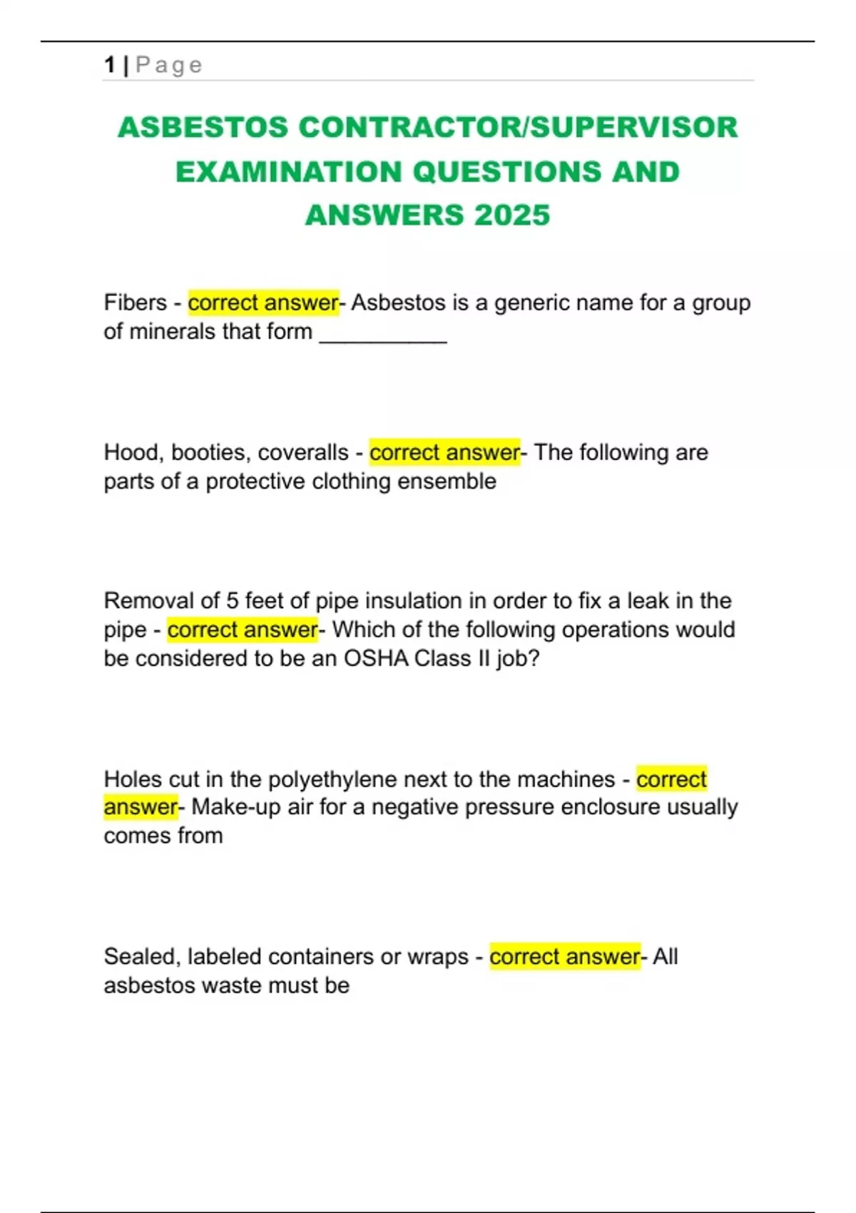 This document presents a comprehensive collection of questions and answers for the 2025 Asbestos Contractor/Supervisor Certification Exam. It thoroughly covers safety procedures, OSHA and EPA regulations, abatement techniques, air sampling, protective equipment, and legal responsibilities. Suitable for professionals preparing for certification or refresher training in asbestos abatement.