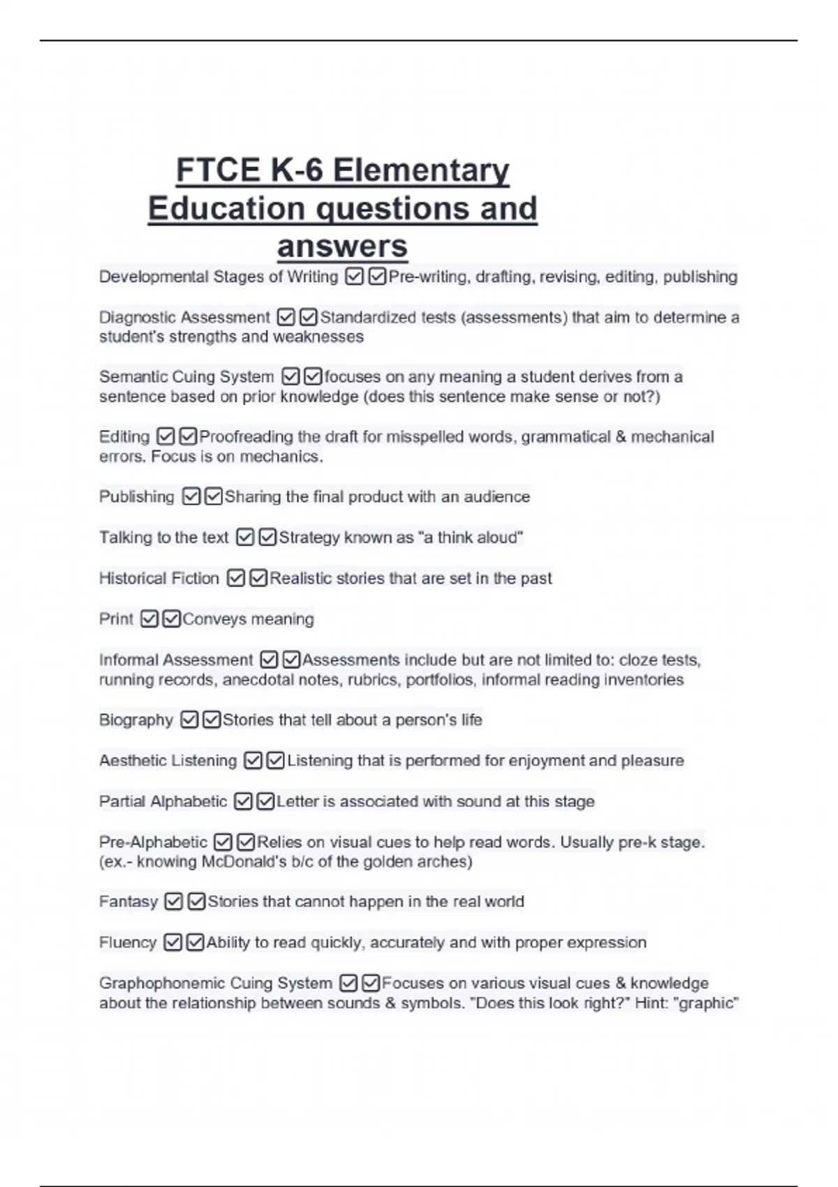 FTCE K-6 Elementary Education questions and answers Developmental Stages of Writing Pre-writing, drafting, revising, editing, publishing Diagnostic Assessment Standardized tests (assessments) that aim to determine a student's strengths and weaknesses Semantic Cuing System focuses on any meaning a student derives from a sentence based on prior knowledge (does this sentence make sense or not?)