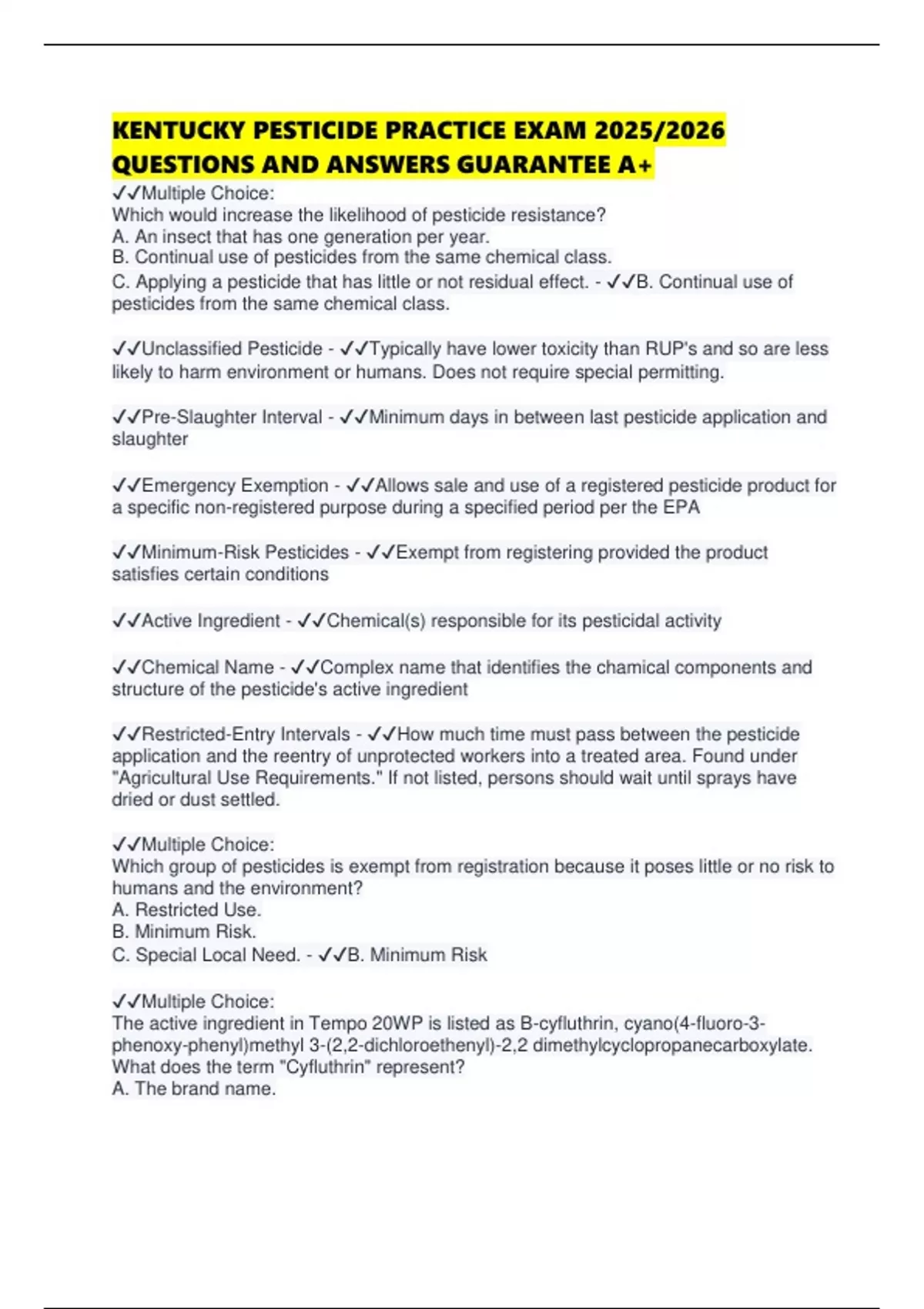 C. Applying a pesticide that has little or not residual effect. - ✔✔B. Continual use of