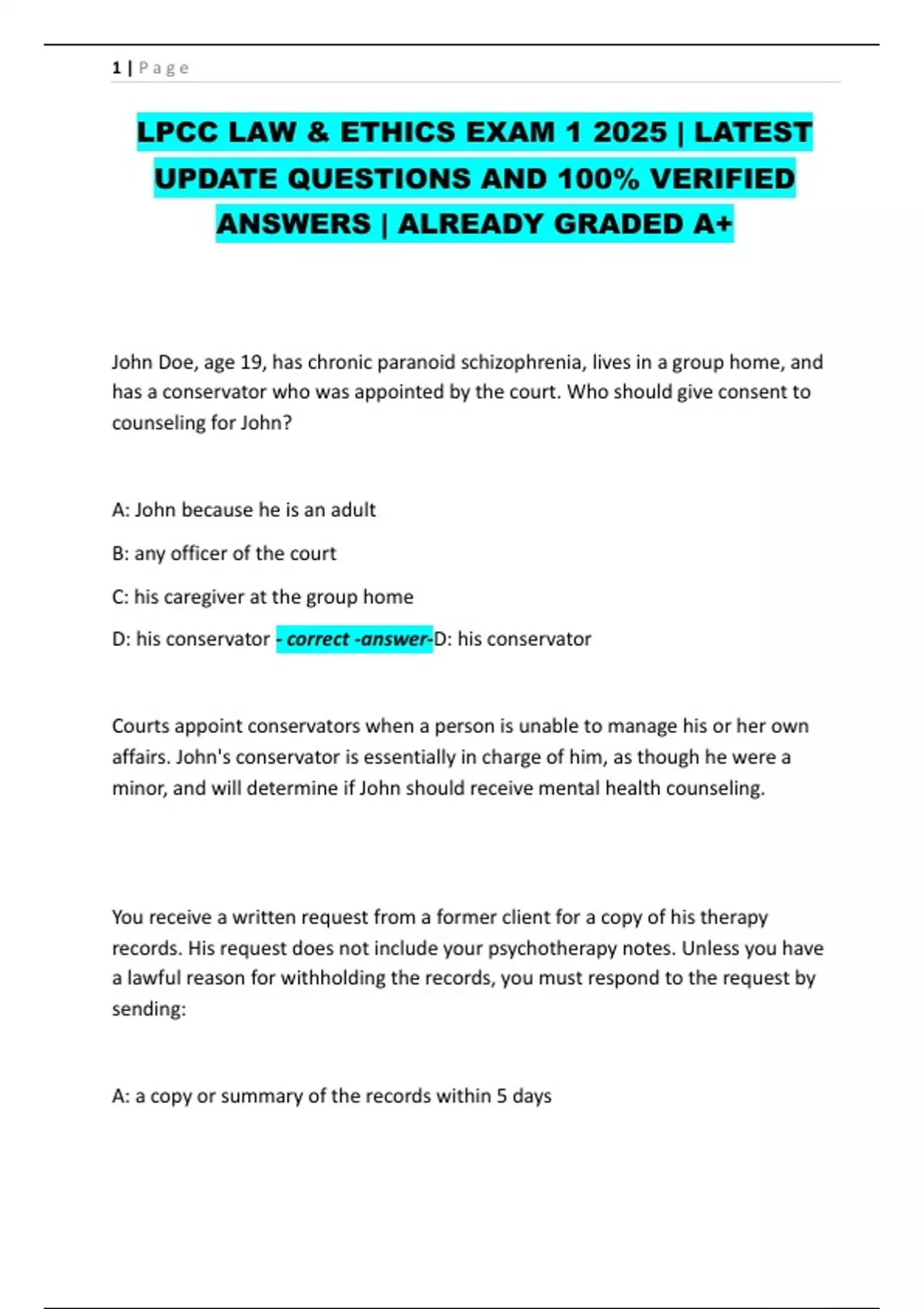LPCC LAW & ETHICS EXAM 1 2025 | LATEST UPDATE QUESTIONS AND 100% VERIFIED ANSWERS | ALREADY GRADED A+