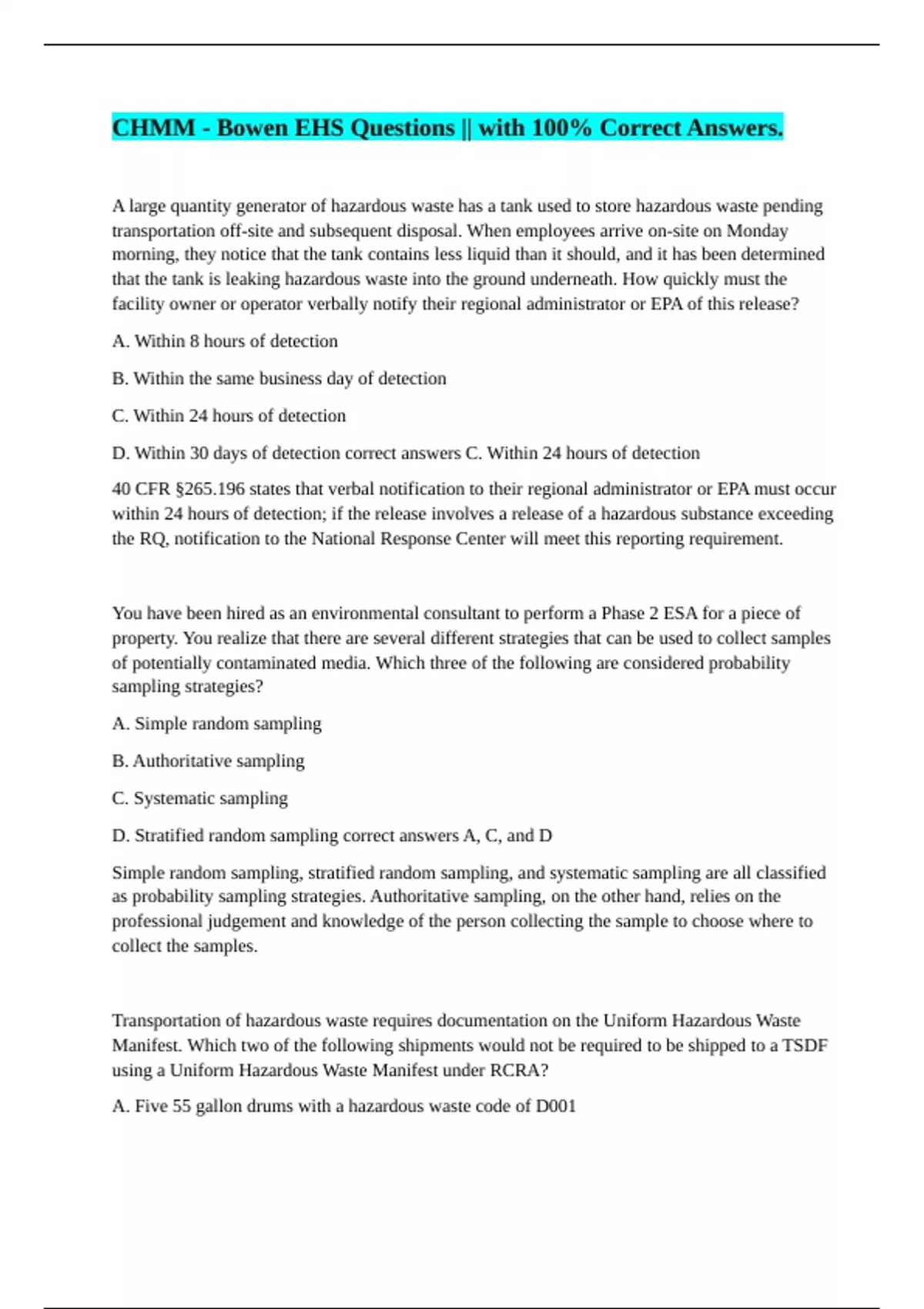 A large quantity generator of hazardous waste has a tank used to store hazardous waste pending transportation off-site and subsequent disposal. When employees arrive on-site on Monday morning, they notice that the tank contains less liquid than it should, and it has been determined that the tank is leaking hazardous waste into the ground underneath. How quickly must the facility owner or operator verbally notify their regional administrator or EPA of this release? A. Within 8 hours of detection B. Within the same business day of detection C. Within 24 hours of detection D. Within 30 days of detection correct answers C. Within 24 hours of detection 40 CFR §265.196 states that verbal notification to their regional administrator or EPA must occur within 24 hours of detection; if the release involves a release of a hazardous substance exceeding the RQ, notification to the National Response Center will meet this reporting requirement. You have been hired as an environmental consultant to perform a Phase 2 ESA for a piece of property. You realize that there are several different strategies that can be used to collect samples of potentially contaminated media. Which three of the following are considered probability sampling strategies? A. Simple random sampling B. Authoritative sampling C. Systematic sampling D. Stratified random sampling correct answers A, C, and D Simple random sampling, stratified random sampling, and systematic sampling are all classified as probability sampling strategies. Authoritative sampling, on the other hand, relies on the professional judgement and knowledge of the person collecting the sample to choose where to collect the samples. Transportation of hazardous waste requires documentation on the Uniform Hazardous Waste Manifest. Which two of the following shipments would not be required to be shipped to a TSDF using a Uniform Hazardous Waste Manifest under RCRA?